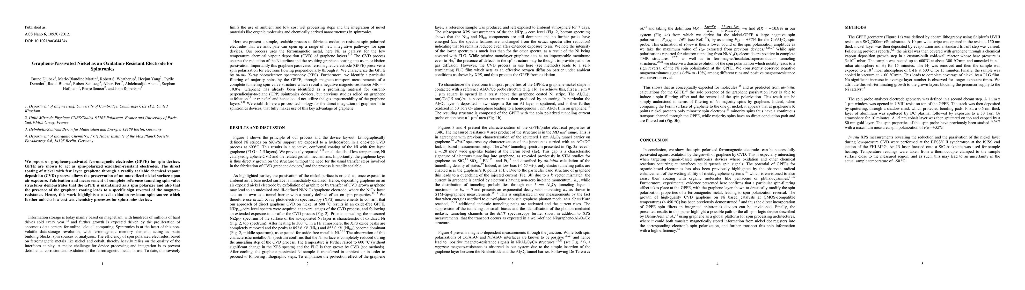 Graphene-passivated ferromagnetic electrodes (GPFE) using a scalable CVD method effectively prevent oxidation of nickel, maintaining its spin-polarizing properties while introducing a unique sign reversal in magneto-resistance, thus offering a cost-effective solution for spintronics.