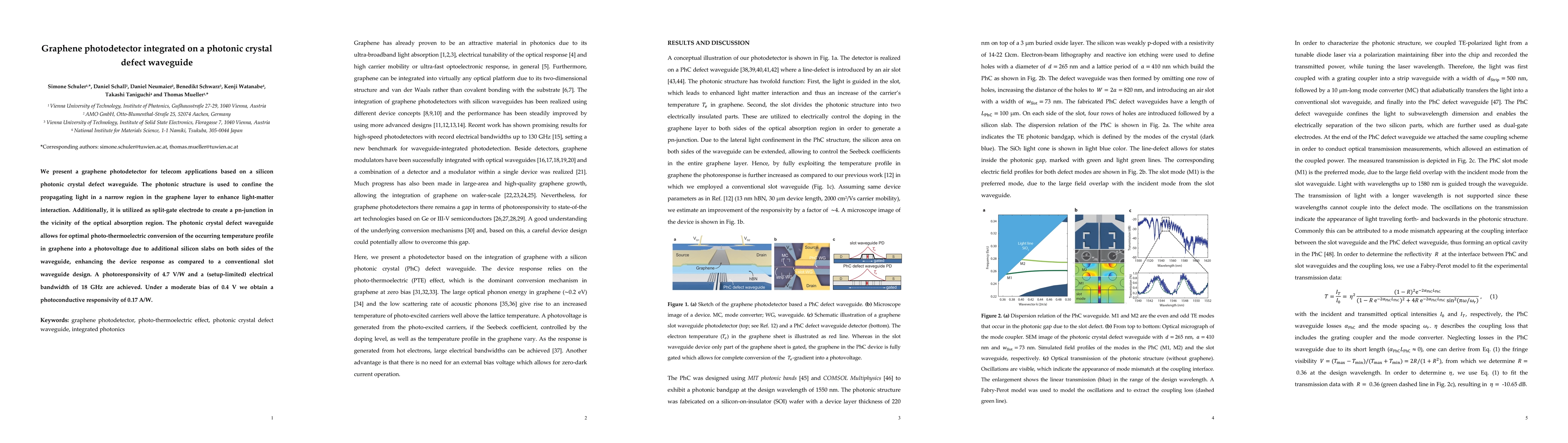 This research presents a graphene photodetector integrated on a silicon photonic crystal defect waveguide for telecom applications, achieving a photoresponsivity of 4.7 V/W and a bandwidth of 18 GHz. The waveguide enhances light-matter interaction and optimizes photo-thermoelectric conversion via split-gate electrodes creating a pn-junction.