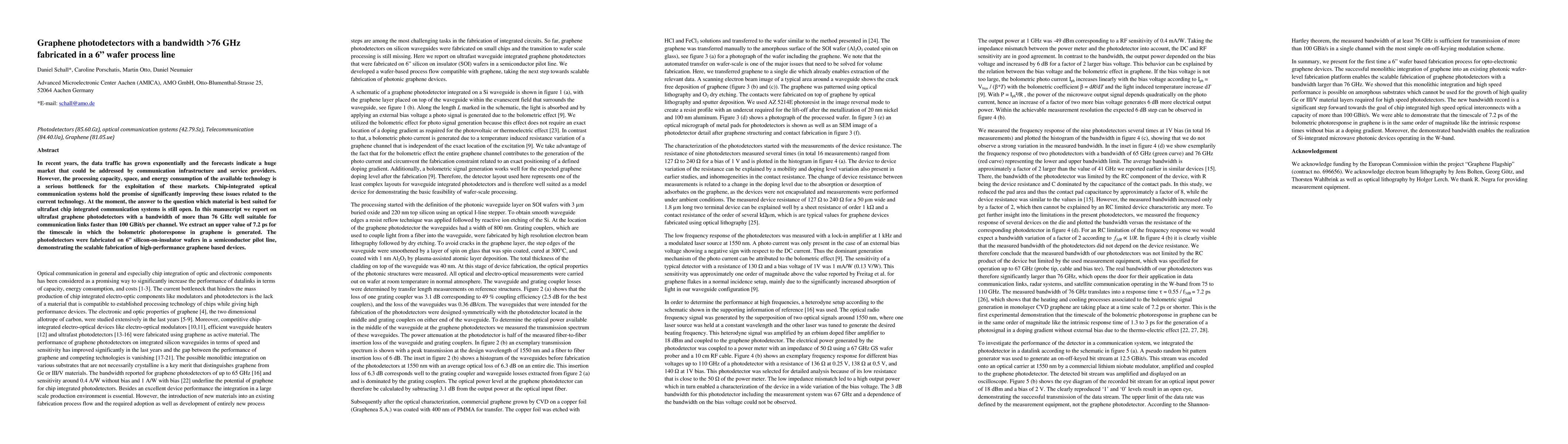 This paper reports on the fabrication of ultrafast graphene photodetectors with a bandwidth exceeding 76 GHz, suitable for high-speed communication links exceeding 100 Gbit/s per channel, and demonstrates scalable production on 6-inch wafers. The study also identifies a bolometric photoresponse generation time of less than 7.2 ps.