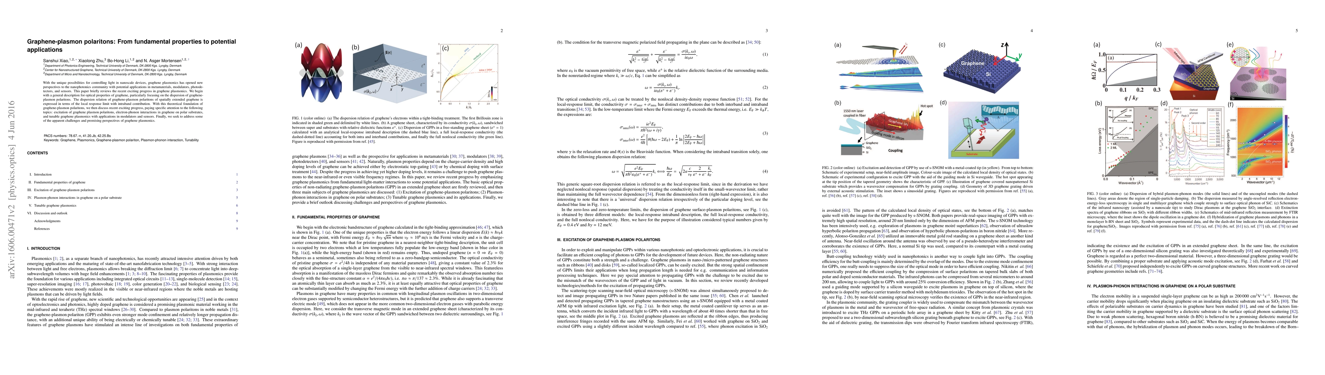 This paper reviews recent advancements in graphene plasmonics, focusing on the optical properties and dispersion of graphene-plasmon polaritons, and discusses their potential applications in metamaterials, modulators, photodetectors, and sensors, while also addressing challenges and future prospects.