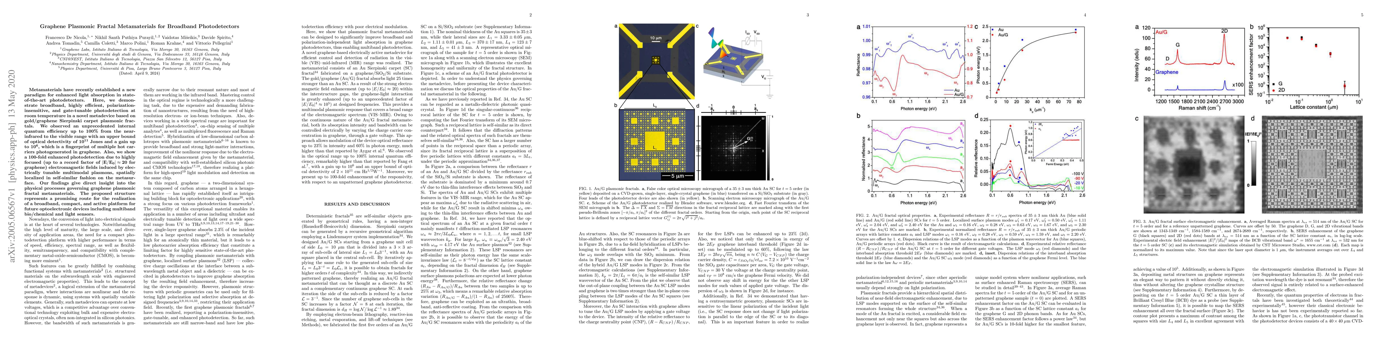 This paper presents a novel graphene plasmonic fractal metamaterial for broadband photodetectors, achieving high efficiency and sensitivity through focused electromagnetic fields and tunable multimodal plasmons. The device demonstrates an internal quantum efficiency up to 100% and a significant 100-fold photodetection enhancement, promising for future optoelectronic applications.