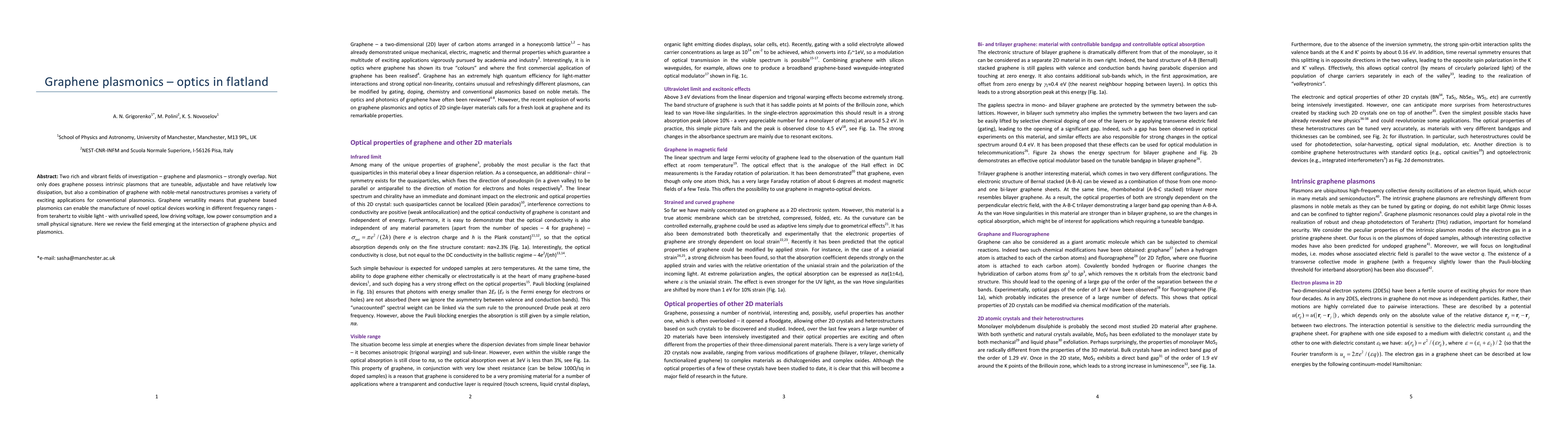 This paper reviews the emerging field of graphene plasmonics, highlighting how graphene's tunable plasmons combined with noble-metal nanostructures can lead to novel optical devices with high speed, low power, and compact sizes across various frequency ranges.