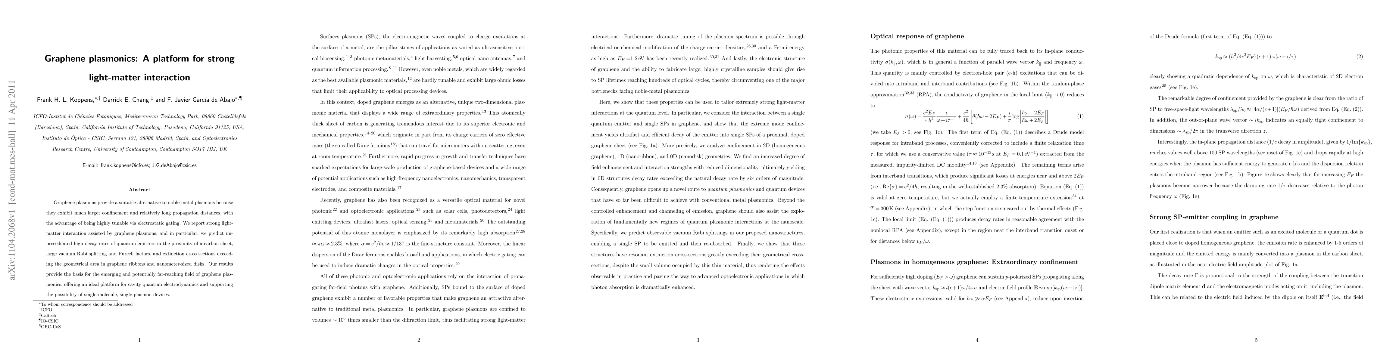 Graphene plasmons provide a suitable alternative to noble-metal plasmons because they exhibit much larger confinement and relatively long propagation distances, with the advantage of being highly tunable via electrostatic gating. We report strong light- matter interaction assisted by graphene plasmons, and in particular, we predict unprecedented high decay rates of quantum emitters in the proximity of a carbon sheet, large vacuum Rabi splitting and Purcell factors, and extinction cross sections exceeding the geometrical area in graphene ribbons and nanometer-sized disks. Our results provide the basis for the emerging and potentially far-reaching field of graphene plasmonics, offering an ideal platform for cavity quantum electrodynamics and supporting the possibility of single-molecule, single-plasmon devices.