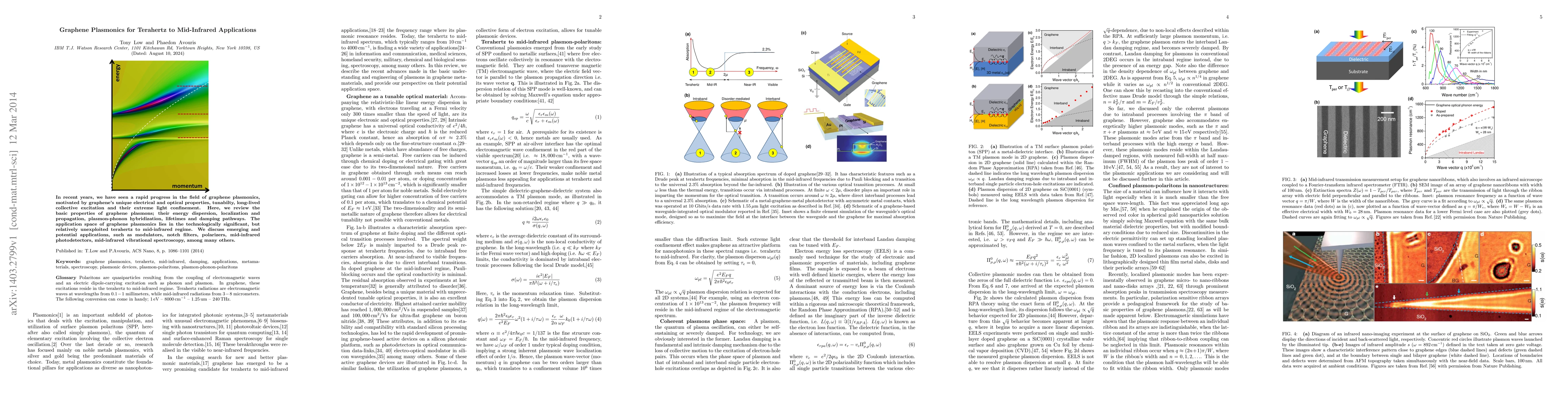 In recent years, we have seen a rapid progress in the field of graphene plasmonics, motivated by graphene's unique electrical and optical properties, tunabilty, long-lived collective excitation and their extreme light confinement. Here, we review the basic properties of graphene plasmons; their energy dispersion, localization and propagation, plasmon-phonon hybridization, lifetimes and damping pathways. The application space of graphene plasmonics lies in the technologically significant, but relatively unexploited terahertz to mid-infrared regime. We discuss emerging and potential applications, such as modulators, notch filters, polarizers, mid-infrared photodetectors, mid-infrared vibrational spectroscopy, among many others.