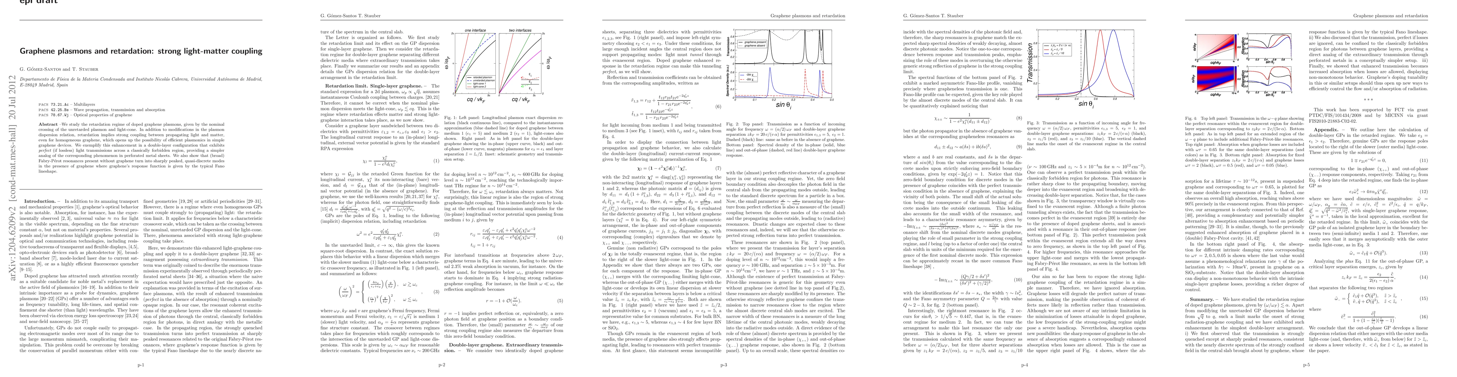 The paper presents a comprehensive analysis of the retardation regime of doped graphene plasmons, revealing strong light-matter coupling and novel transmission phenomena in simple graphene devices.