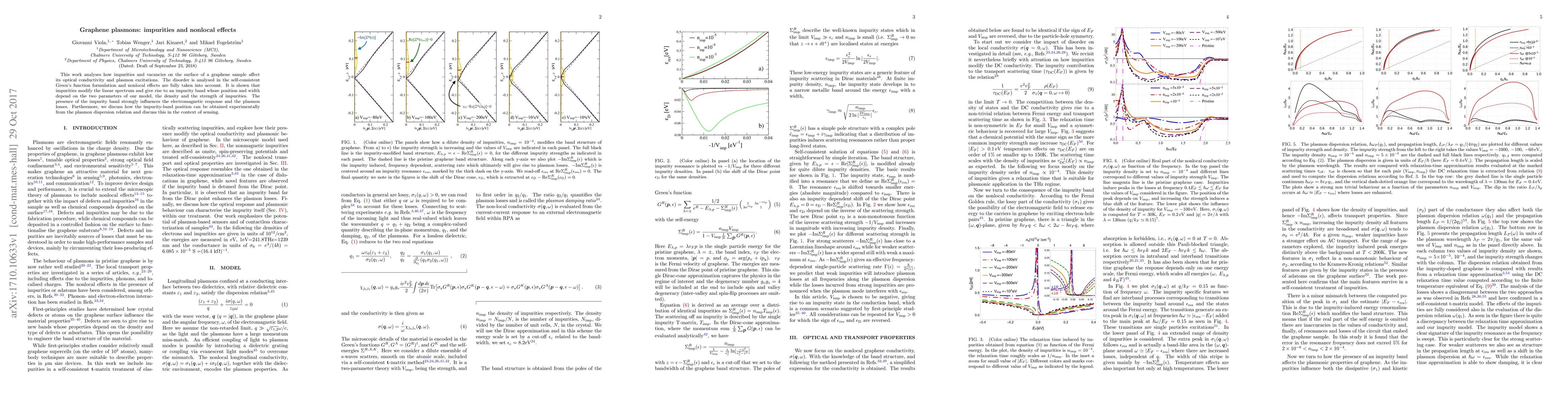This study investigates how impurities and vacancies in graphene affect its optical conductivity and plasmon excitations, revealing that impurities create an impurity band influencing electromagnetic response and plasmon losses, with implications for sensing applications. The analysis incorporates nonlocal effects and disorder using self-consistent Green's function methods.