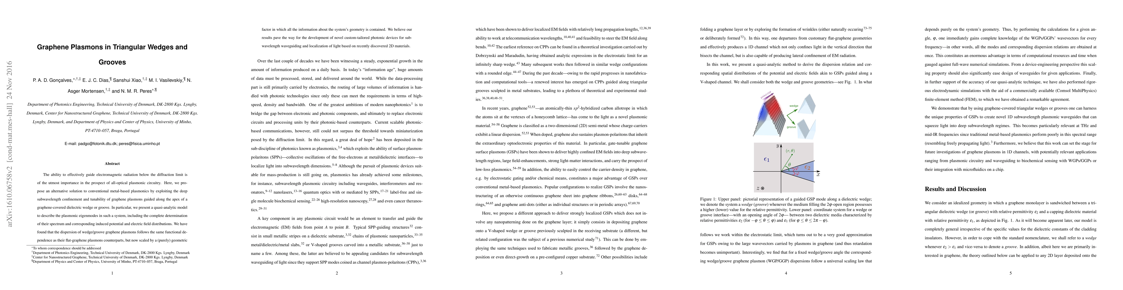 This paper proposes using graphene plasmons guided along triangular wedges and grooves for subwavelength electromagnetic radiation confinement, presenting a quasi-analytic model for their eigenmodes. The study finds that the dispersion of these plasmons follows a geometric scaling of flat graphene plasmons, suggesting potential for advanced photonic devices based on 2D materials.