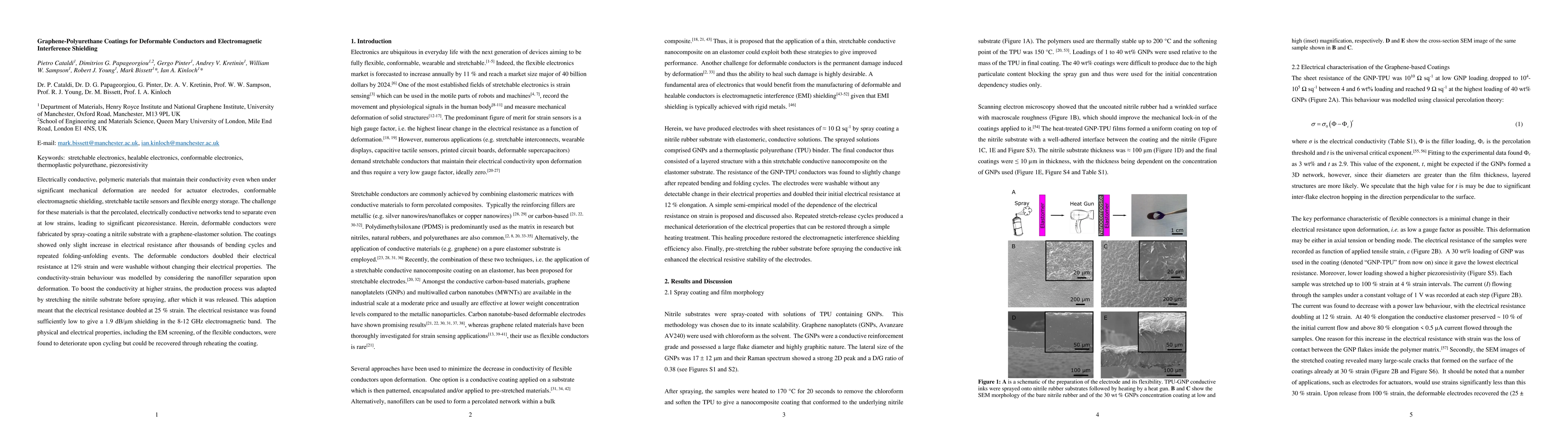 Graphene-polyurethane coatings on nitrile substrates maintain conductivity under mechanical deformation, showing minimal resistance increase after repeated bending cycles. The coatings provide 1.9 dB/μm shielding in the 8-12 GHz band, with properties that can be restored via reheating after cycling.