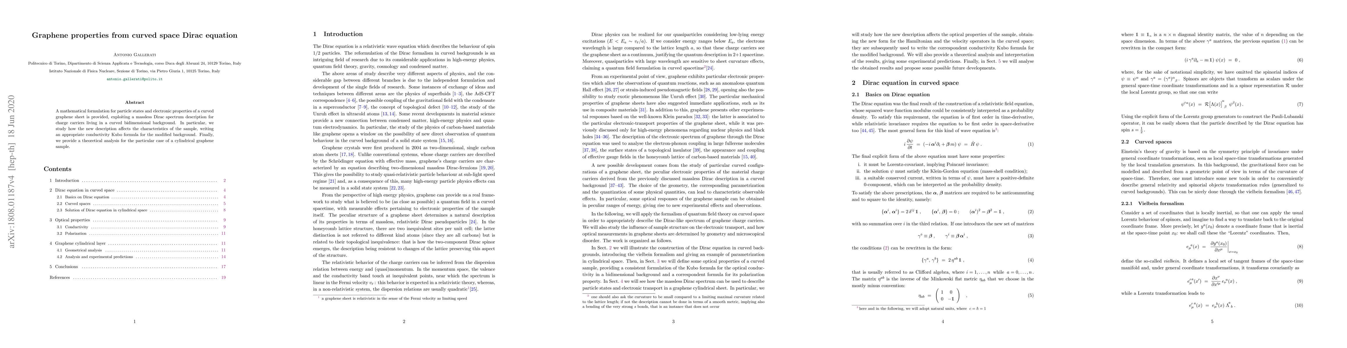 This paper develops a mathematical framework for graphene's electronic properties on a curved surface using a massless Dirac equation, and analyzes the conductivity of cylindrical graphene, providing insights into how curvature affects its characteristics.