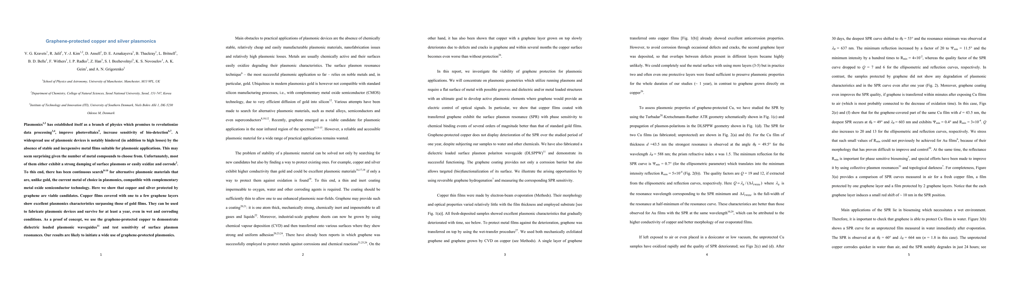 This paper demonstrates that graphene-protected copper and silver films exhibit superior plasmonic properties compared to gold, offering a stable, inexpensive alternative for plasmonic devices that can function well even in harsh conditions. The study also shows successful fabrication of dielectric loaded plasmonic waveguides using graphene-protected copper, suggesting potential for widespread adoption in various applications.