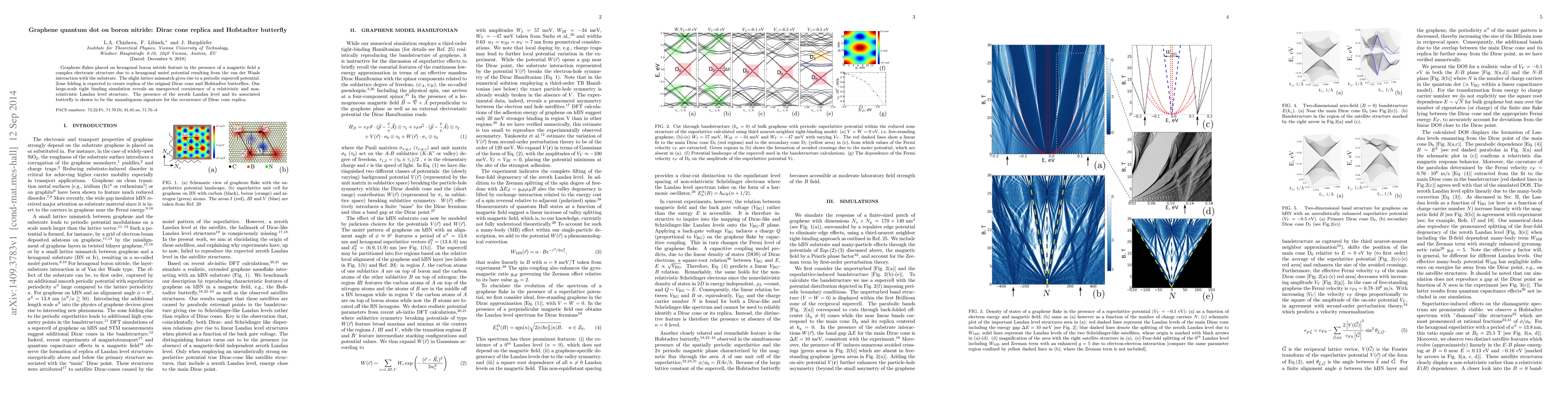 This research paper investigates the electronic structure of graphene flakes on hexagonal boron nitride under a magnetic field, revealing a complex moiré potential. Simulations show a coexistence of relativistic and non-relativistic Landau levels, with the zeroth Landau level indicating the presence of Dirac cone replicas and Hofstadter butterfly patterns.