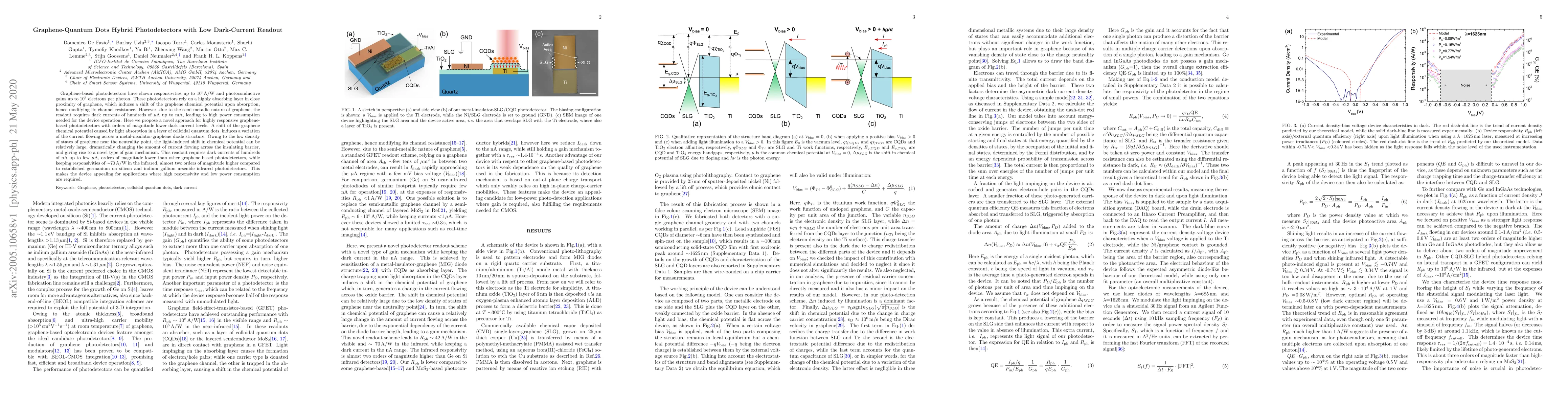 The paper proposes a novel graphene-quantum dots hybrid photodetector with significantly lower dark current, achieving high responsivity of ~70A/W in the infrared, and demonstrating low power consumption due to dark currents in the range of hundreds of nA to few μA. This new approach leverages a metal-insulator-graphene diode structure to enhance photodetection efficiency while drastically reducing power consumption compared to conventional graphene photodetectors.