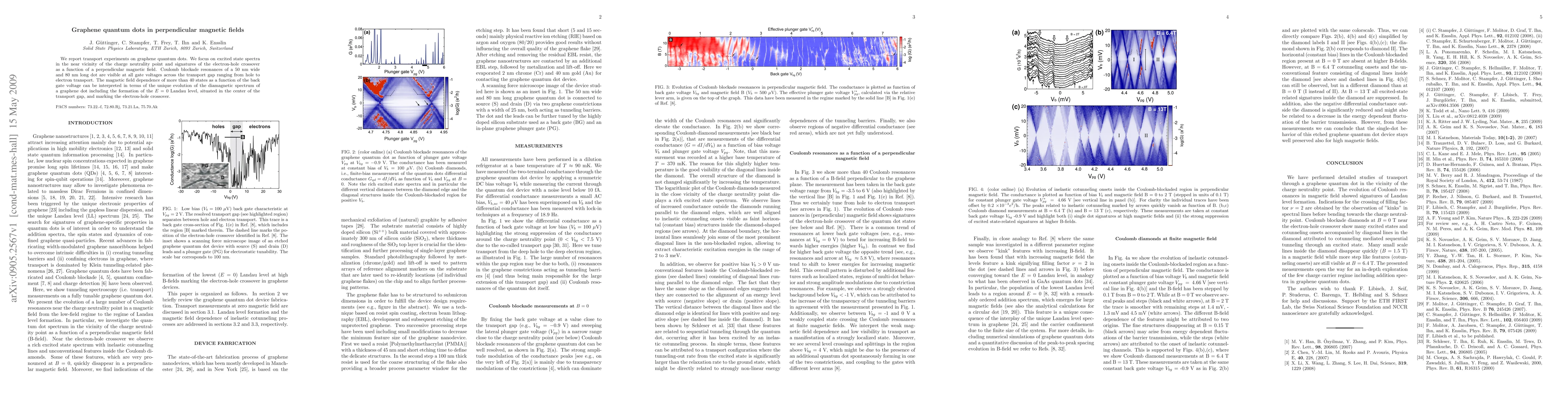 This study investigates transport in graphene quantum dots under perpendicular magnetic fields, revealing Coulomb blockade resonances across the charge neutrality point and the electron-hole crossover. The magnetic field influences over 40 states, highlighting the formation of the central E = 0 Landau level marking the crossover.