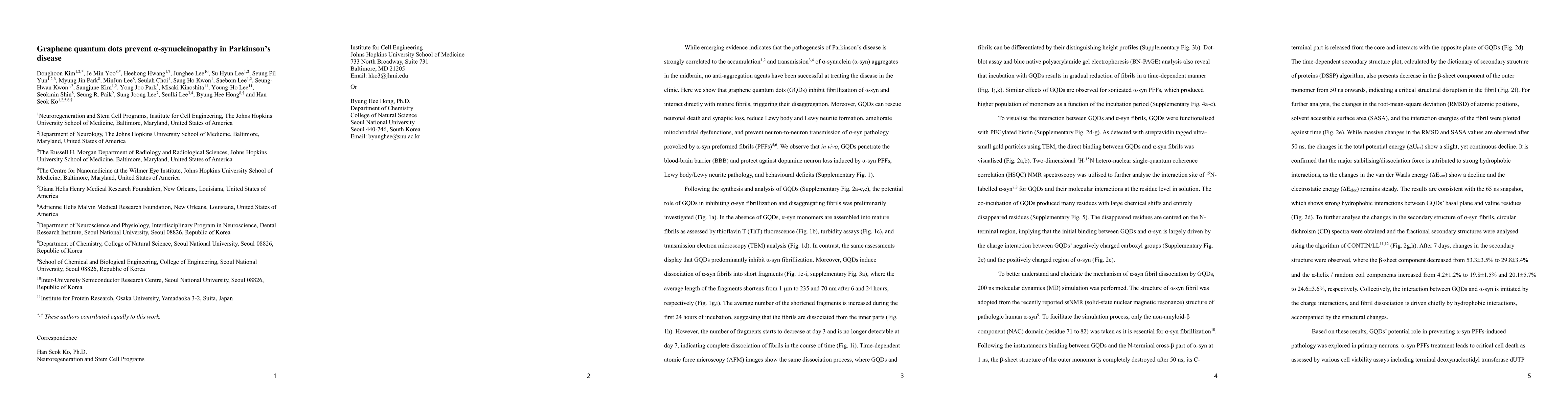 Graphene quantum dots (GQDs) inhibit and disaggregate alpha-synuclein aggregates, preventing alpha-synucleinopathy in Parkinson's disease by rescuing neuronal health and mitigating behavioral deficits, offering a novel therapeutic approach. In vivo studies show GQDs cross the blood-brain barrier and protect dopamine neurons, highlighting their potential in treating Parkinson's.