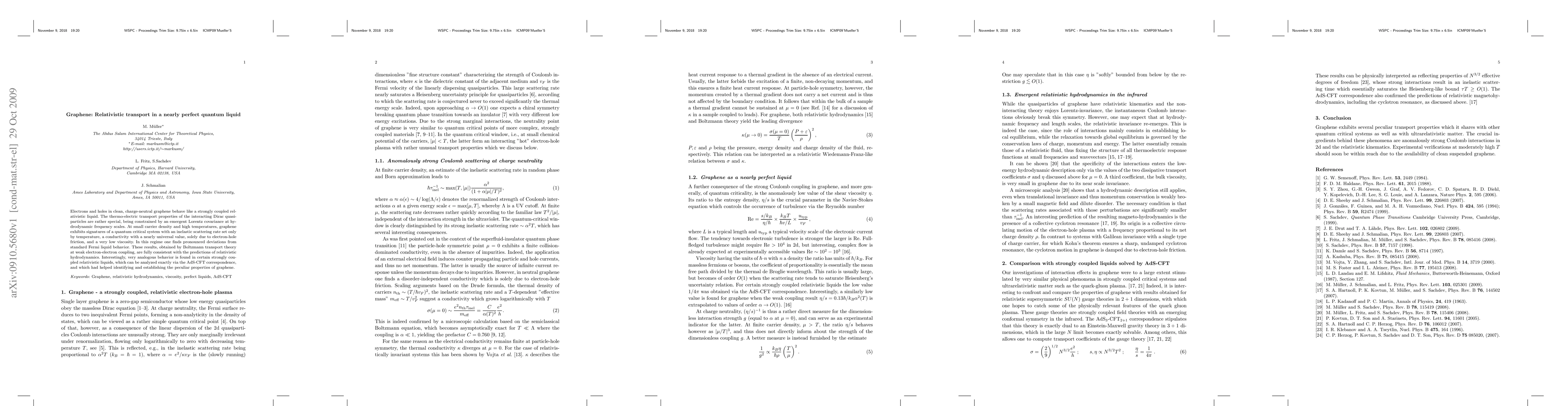 Electrons and holes in clean, charge-neutral graphene behave like a strongly coupled relativistic liquid. The thermo-electric transport properties of the interacting Dirac quasiparticles are rather special, being constrained by an emergent Lorentz covariance at hydrodynamic frequency scales. At small carrier density and high temperatures, graphene exhibits signatures of a quantum critical system with an inelastic scattering rate set only by temperature, a conductivity with a nearly universal value, solely due to electron-hole friction, and a very low viscosity. In this regime one finds pronounced deviations from standard Fermi liquid behavior. These results, obtained by Boltzmann transport theory at weak electron-electron coupling, are fully consistent with the predictions of relativistic hydrodynamics. Interestingly, very analogous behavior is found in certain strongly coupled relativistic liquids, which can be analyzed exactly via the AdS-CFT correspondence, and which had helped identifying and establishing the peculiar properties of graphene.