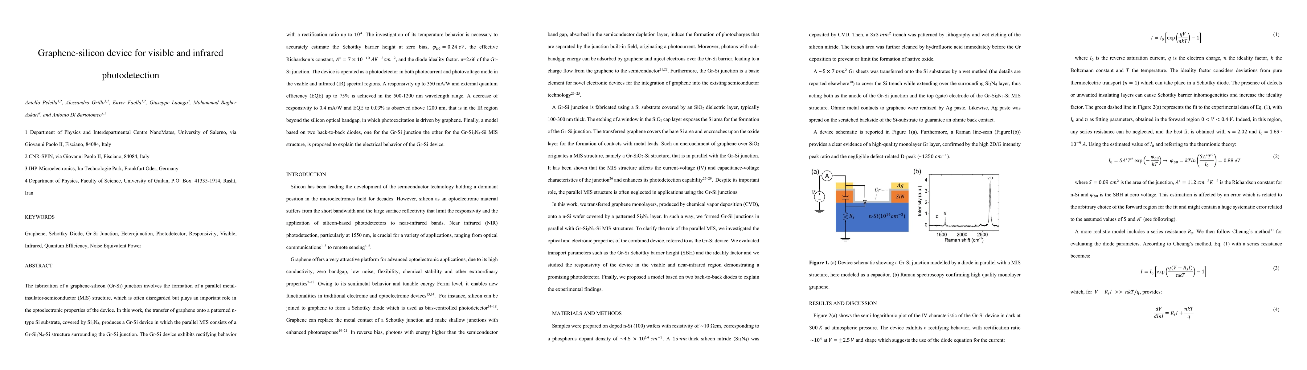 This paper details the fabrication of a graphene-silicon junction device that exhibits rectifying behavior and operates as a photodetector in the visible and infrared spectral regions. The device achieves high responsivity and quantum efficiency in the 500-1200 nm range, with a model explaining its electrical behavior based on two back-to-back diodes.