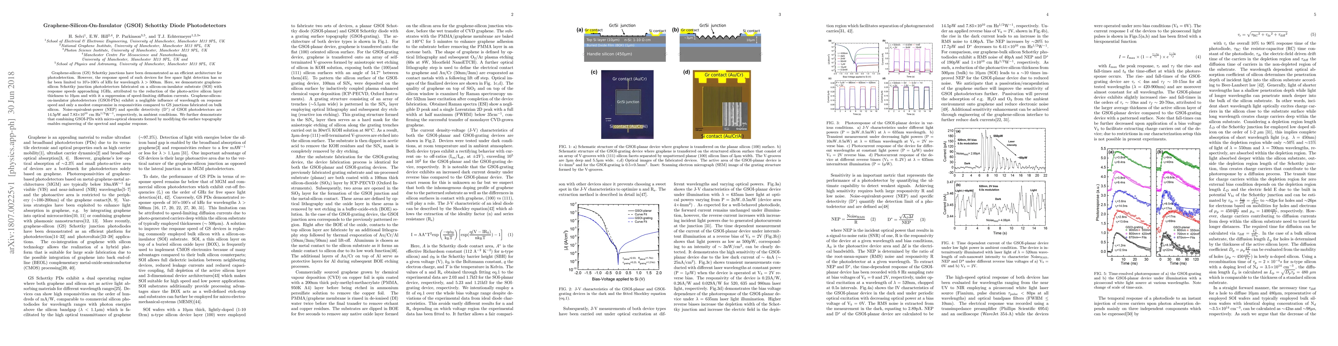 This paper demonstrates graphene-silicon-on-insulator (GSOI) Schottky junction photodetectors with response speeds up to 1GHz, significantly improved by reducing the silicon layer thickness to 10µm. These GSOI photodetectors achieve high responsivity and low noise, enabling efficient free space light detection.