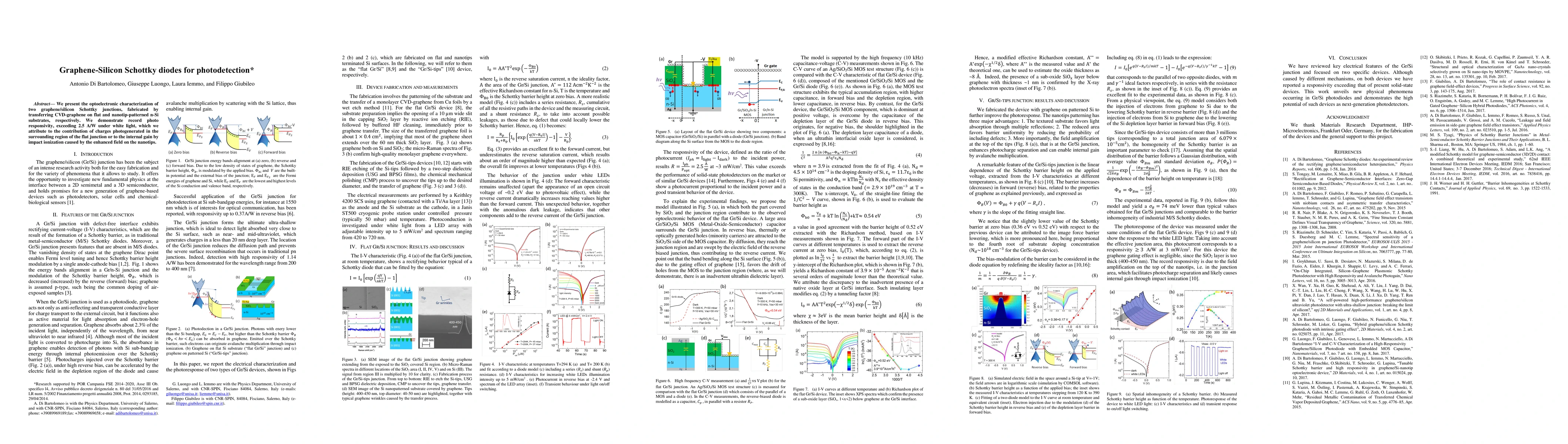 This paper investigates graphene/silicon Schottky junctions for photodetection, showing record photo responsivity of over 2.5 A/W under white light, attributed to charge generation near the flat junction or impact ionization on nanotip patterns.