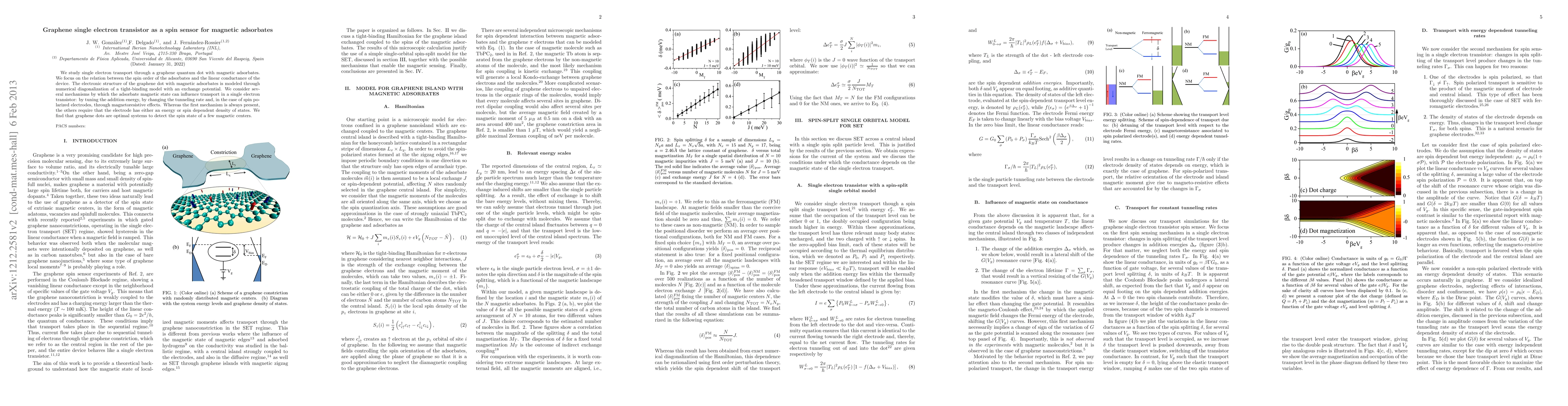 This paper investigates how magnetic adsorbates affect the conductance of a graphene quantum dot in a single electron transistor, finding that graphene dots are effective in detecting the spin state of magnetic centers through various mechanisms including addition energy tuning and magnetoresistive effects.