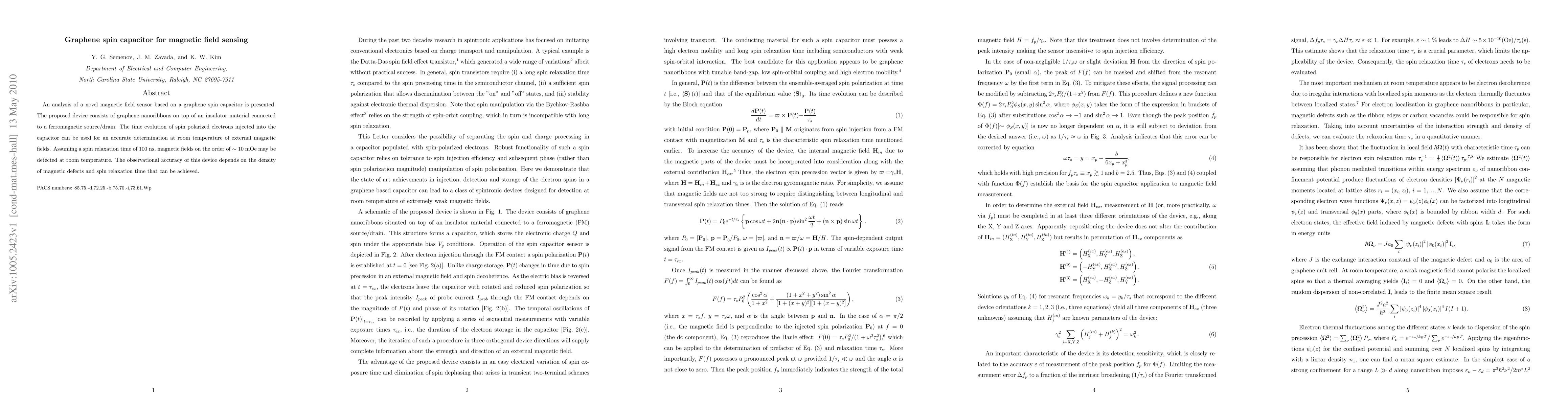 This paper introduces a graphene spin capacitor for magnetic field sensing, utilizing graphene nanoribbons and a ferromagnetic source/drain to detect external magnetic fields at room temperature. The device's accuracy depends on magnetic defect density and spin relaxation time, potentially detecting fields around 10 mOe.
