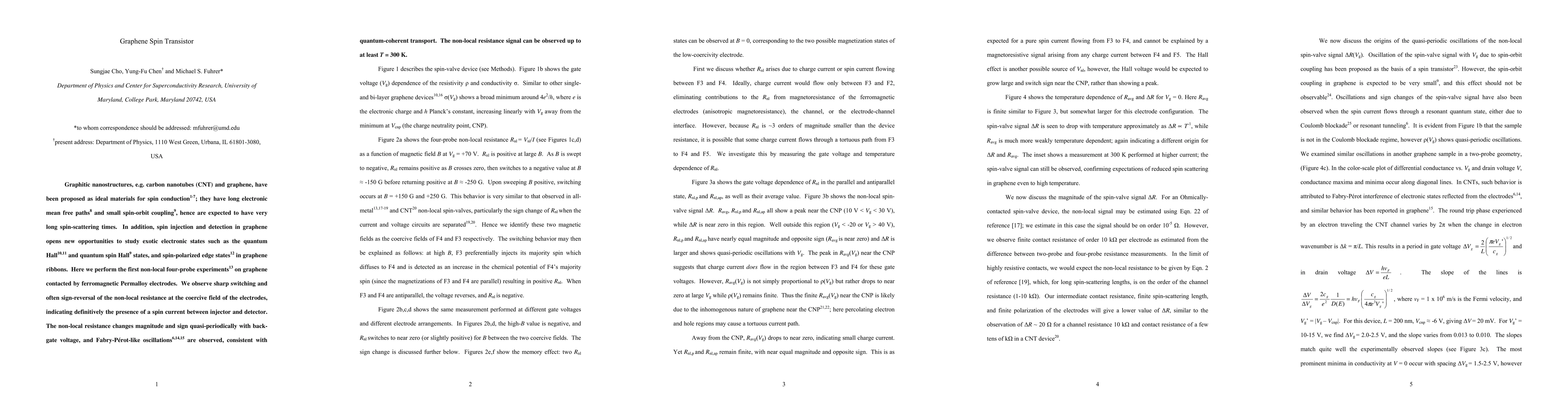 Graphitic nanostructures, e.g. carbon nanotubes (CNT) and graphene, have been proposed as ideal materials for spin conduction[1-7]; they have long electronic mean free paths[8] and small spin-orbit coupling[9], hence are expected to have very long spin-scattering times. In addition, spin injection and detection in graphene opens new opportunities to study exotic electronic states such as the quantum Hall[10,11] and quantum spin Hall[9] states, and spin-polarized edge states[12] in graphene ribbons. Here we perform the first non-local four-probe experiments[13] on graphene contacted by ferromagnetic Permalloy electrodes. We observe sharp switching and often sign-reversal of the non-local resistance at the coercive field of the electrodes, indicating definitively the presence of a spin current between injector and detector. The non-local resistance changes magnitude and sign quasi-periodically with back-gate voltage, and Fabry-Perot-like oscillations[6,14,15] are observed, consistent with quantum-coherent transport. The non-local resistance signal can be observed up to at least T = 300 K.