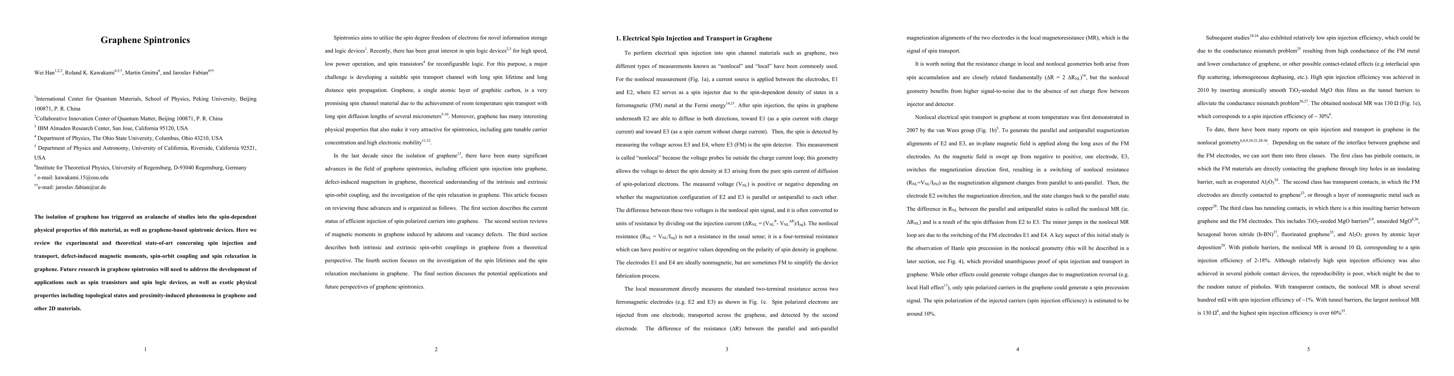 This paper reviews current advancements in graphene spintronics, focusing on spin injection, transport, and relaxation, and highlights future research directions for spin-based devices and exotic physical phenomena in 2D materials.