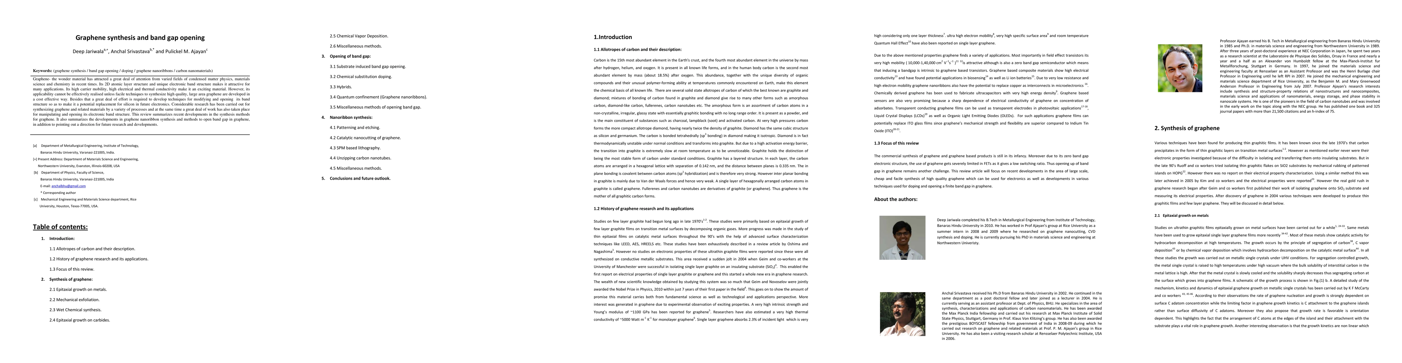 Graphene- the wonder material has attracted a great deal of attention from varied fields of condensed matter physics, materials science and chemistry in recent times. Its 2D atomic layer structure and unique electronic band structure makes it attractive for many applications. Its high carrier mobility, high electrical and thermal conductivity make it an exciting material. However, its applicability cannot be effectively realised unless facile techniques to synthesize high quality, large area graphene are developed in a cost effective way. Besides that a great deal of effort is required to develop techniques for modifying and opening its band structure so as to make it a potential replacement for silicon in future electronics. Considerable research has been carried out for synthesizing graphene and related materials by a variety of processes and at the same time a great deal of work has also taken place for manipulating and opening its electronic band structure. This review summarizes recent developments in the synthesis methods for graphene. It also summarizes the developments in graphene nanoribbon synthesis and methods to open band gap in graphene, in addition to pointing out a direction for future research and developments.