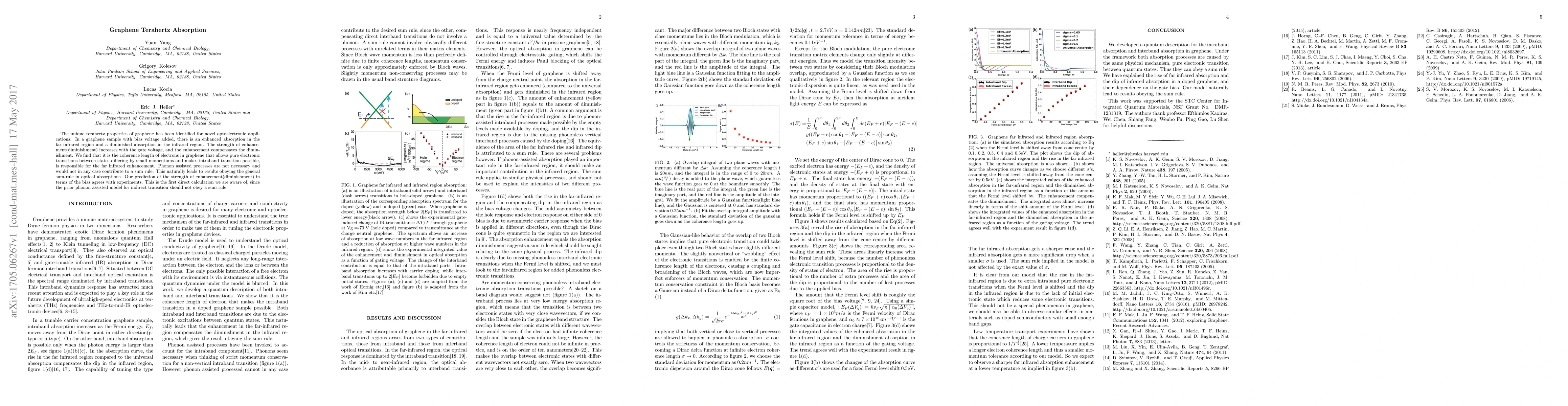 Graphene exhibits enhanced terahertz absorption due to coherent electronic transitions, with absorption strengths varying with gate voltage; this behavior does not rely on phonon-assisted processes and complies with optical sum rules. Experimental results corroborate the predicted relationship between bias voltage and absorption modulation.