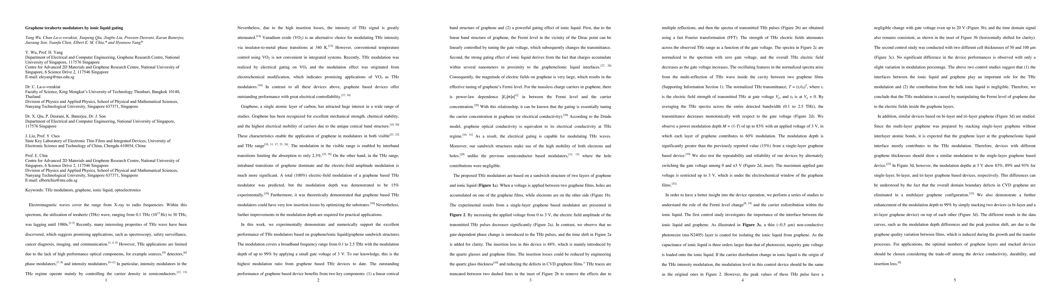 Graphene terahertz modulators can control THz transmittance using ionic liquid gating, achieving up to 93% modulation with a single device at room temperature.