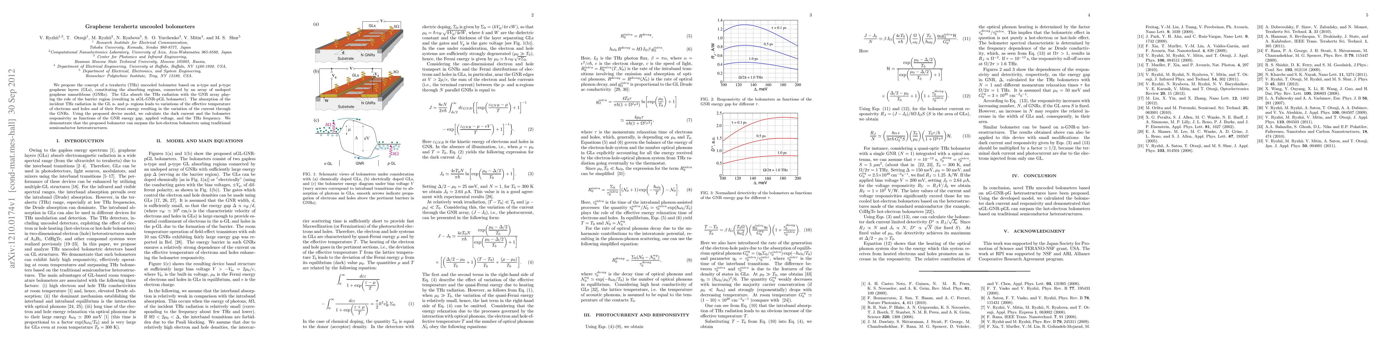 Graphene terahertz uncooled bolometers utilize n-type and p-type graphene layers with undoped graphene nanoribbons to achieve high responsivity, surpassing traditional hot-electron bolometers by leveraging the Fermi energy and effective temperature variations.