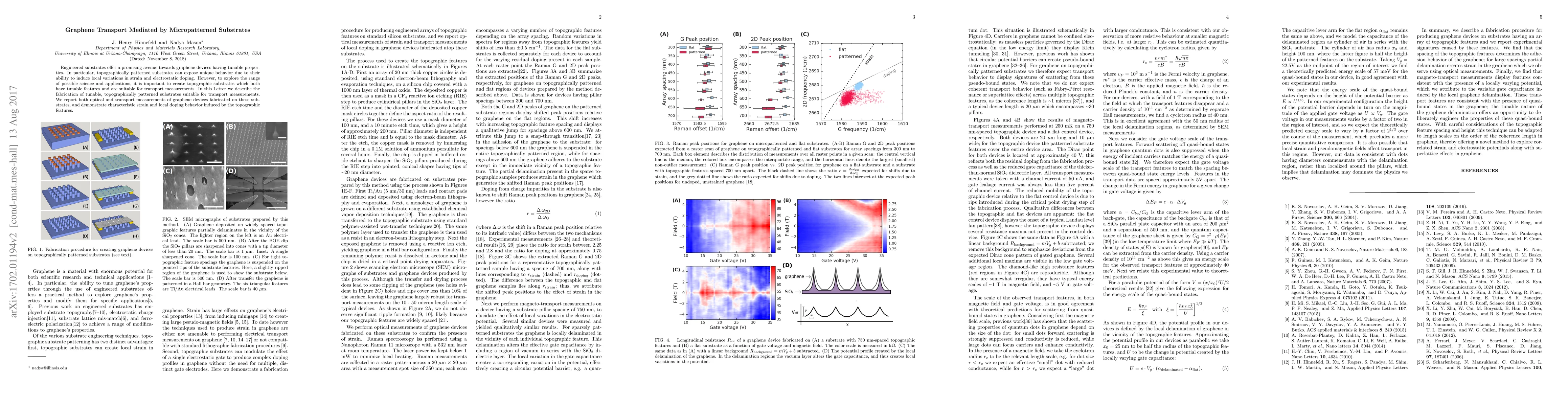This research details the fabrication of tunable, micropatterned substrates for graphene transport studies, revealing unique strain and electrostatic doping behaviors induced by topographical features, as evidenced by optical and transport measurements.