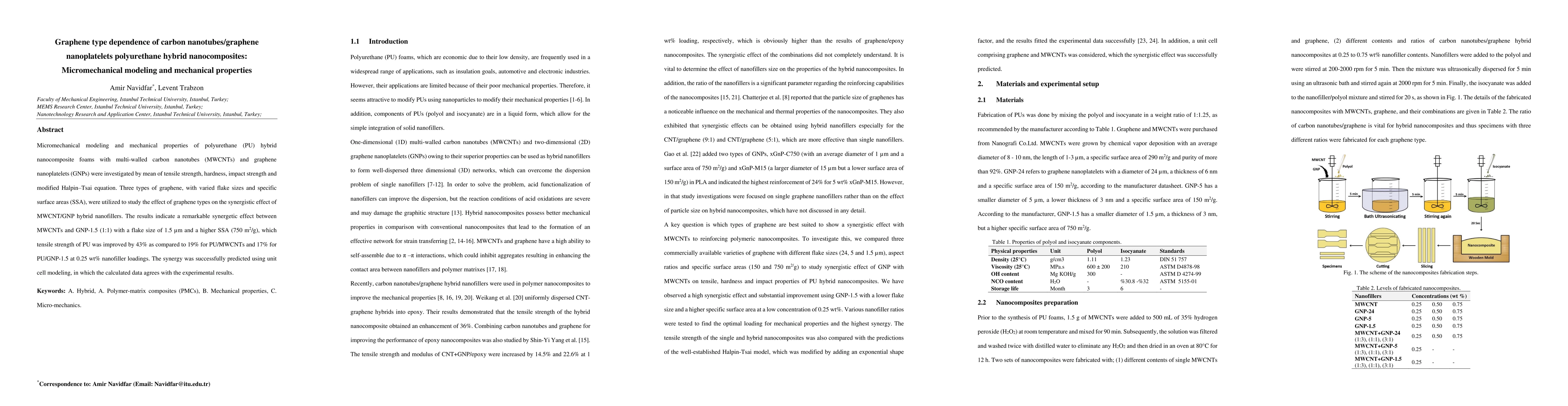 Micromechanical modeling and mechanical properties of polyurethane (PU) hybrid nanocomposite foams with multi-walled carbon nanotubes (MWCNTs) and graphene nanoplatelets (GNPs) were investigated by mean of tensile strength, hardness, impact strength and modified Halpin-Tsai equation. Three types of graphene, with varied flake sizes and specific surface areas (SSA), were utilized to study the effect of graphene types on the synergistic effect of MWCNT/GNP hybrid nanofillers. The results indicate a remarkable synergetic effect between MWCNTs and GNP-1.5 (1:1) with a flake size of 1.5 {\mu}m and a higher SSA (750 m^2/g), which tensile strength of PU was improved by 43% as compared to 19% for PU/MWCNTs and 17% for PU/GNP-1.5 at 0.25 wt% nanofiller loadings. The synergy was successfully predicted using unit cell modeling, in which the calculated data agrees with the experimental results.