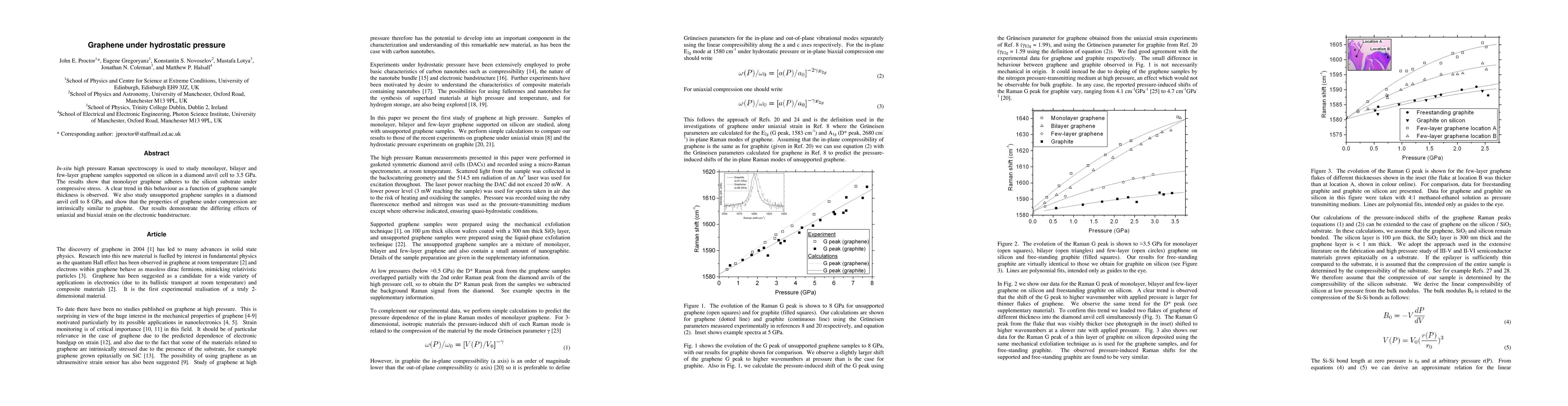In-situ high pressure Raman spectroscopy is used to study monolayer, bilayer and few-layer graphene samples supported on silicon in a diamond anvil cell to 3.5 GPa. The results show that monolayer graphene adheres to the silicon substrate under compressive stress. A clear trend in this behaviour as a function of graphene sample thickness is observed. We also study unsupported graphene samples in a diamond anvil cell to 8 GPa, and show that the properties of graphene under compression are intrinsically similar to graphite. Our results demonstrate the differing effects of uniaxial and biaxial strain on the electronic bandstructure.
