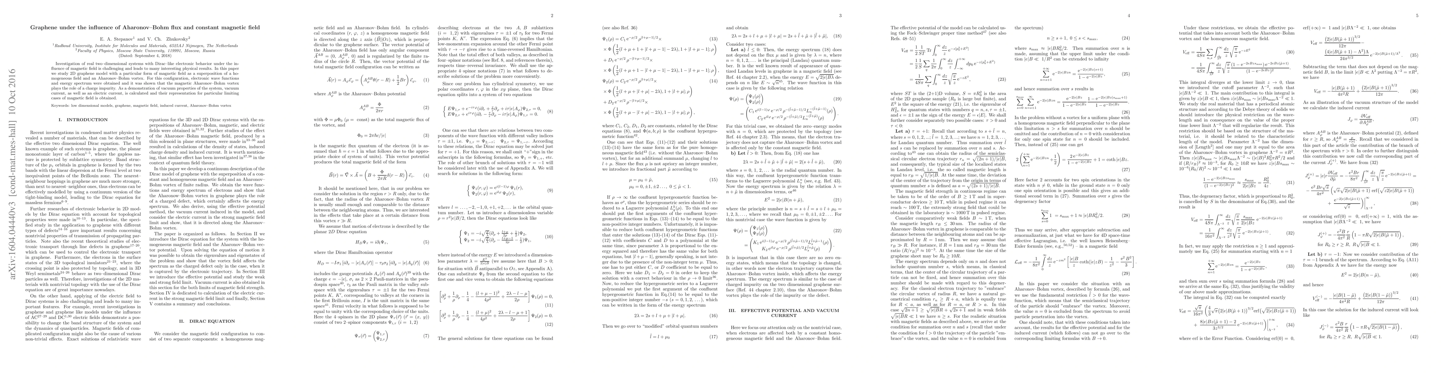 This paper investigates the electronic behavior of 2D graphene under a combined magnetic field of a homogeneous field and an Aharonov-Bohm vortex, revealing the vortex's role as a charge impurity. It also calculates vacuum and electric currents, demonstrating the system's vacuum properties.