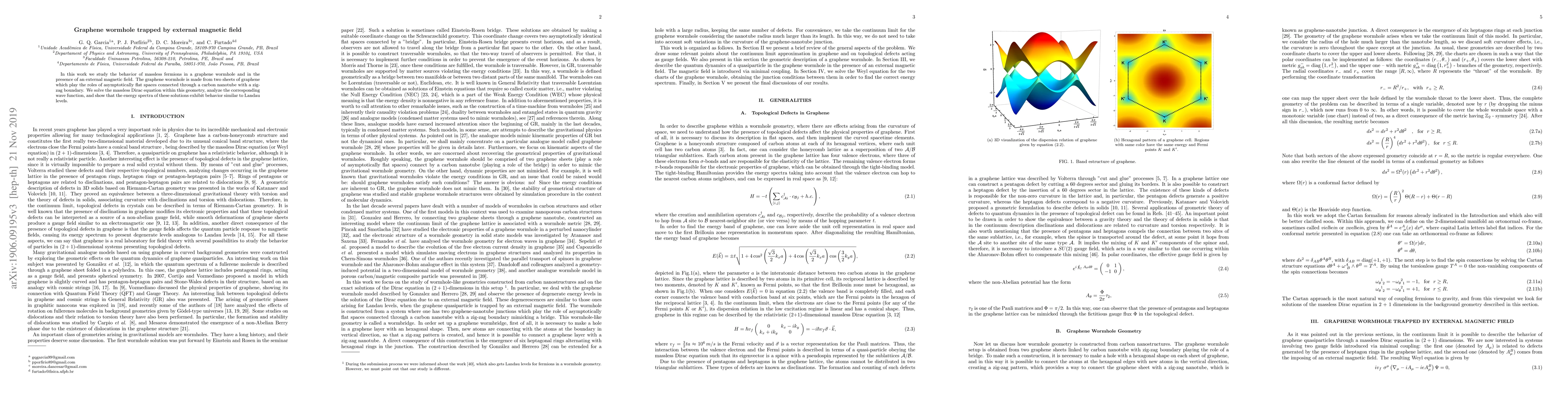 In this work we study the behavior of massless fermions in a graphene wormhole and in the presence of an external magnetic field. The graphene wormhole is made from two sheets of graphene that play the roles of asymptotically flat spaces connected through a carbon nanotube with a zig-zag boundary. We solve the massless Dirac equation in this geometry and analyze its wave function. We show that the energy spectra of these solutions exhibit similar behavior to Landau levels.