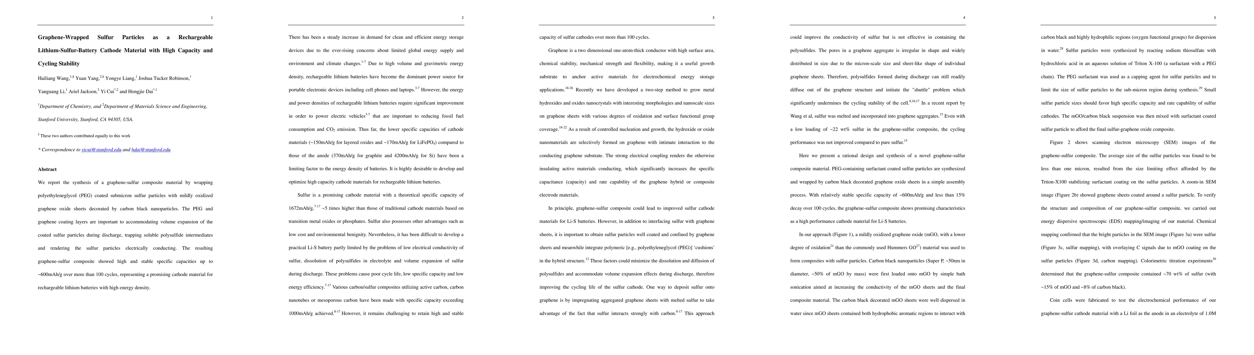 This paper details the synthesis of a graphene-sulfur composite that wraps polyethyleneglycol coated sulfur particles with graphene oxide sheets, achieving high capacity and cycling stability in lithium-sulfur batteries. The composite demonstrates specific capacities of ~600mAh/g over 100 cycles, indicating its potential as a superior cathode material.