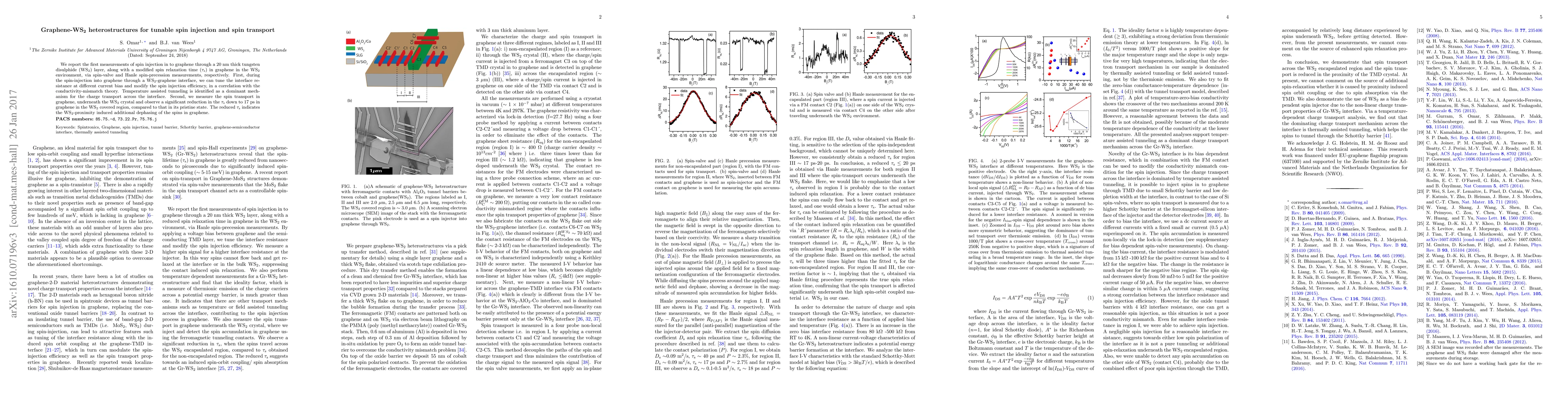 This paper reports tunable spin injection into graphene via a WS$_2$ layer, demonstrating interface resistance tuning and modified spin relaxation times in graphene under WS$_2$, with temperature-assisted tunneling identified as the primary charge transport mechanism. It also reveals significant spin dephasing in graphene near WS$_2$, reducing spin relaxation time to 17 ps.