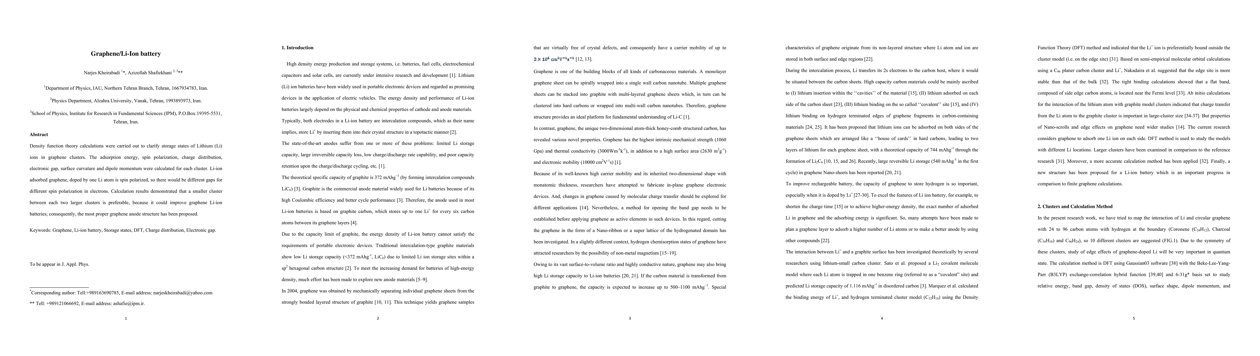 Density function theory calculations were carried out to clarify storage states of Lithium (Li) ions in graphene clusters. The adsorption energy, spin polarization, charge distribution, electronic gap, surface curvature and dipole momentum were calculated for each cluster. Li-ion adsorbed graphene, doped by one Li atom is spin polarized, so there would be different gaps for different spin polarization in electrons. Calculation results demonstrated that a smaller cluster between each two larger clusters is preferable, because it could improve graphene Li-ion batteries; consequently, the most proper graphene anode structure has been proposed.