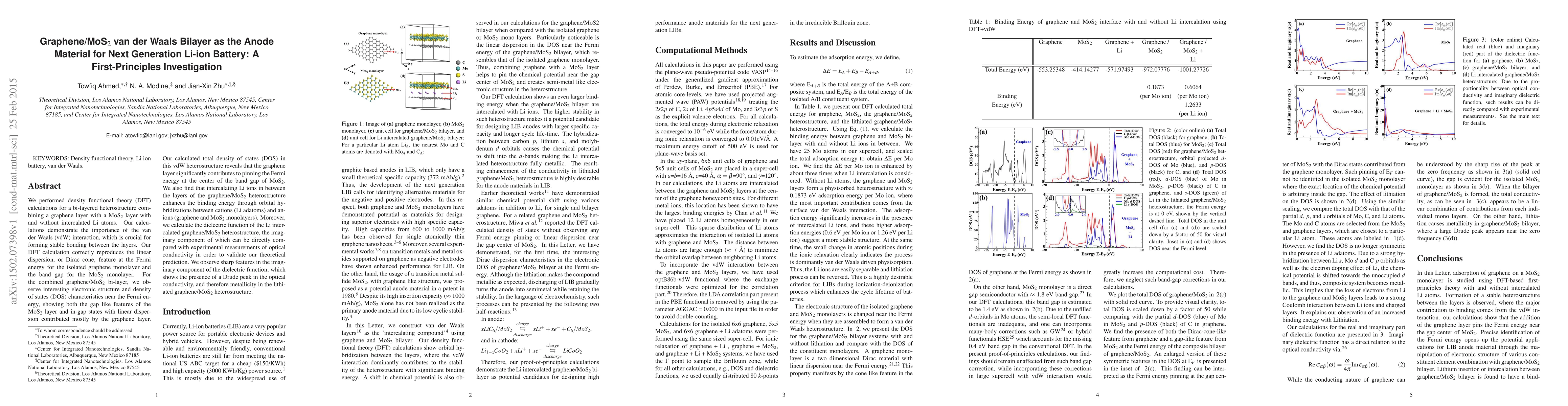 We performed density functional theory (DFT) calculations for a bi-layered heterostructure combining a graphene layer with a MoS2 layer with and without intercalated Li atoms. Our calculations demonstrate the importance of the van der Waals (vdW) interaction, which is crucial for forming stable bonding between the layers. Our DFT calculation correctly reproduces the linear dispersion, or Dirac cone, feature at the Fermi energy for the isolated graphene monolayer and the band gap for the MoS2 monolayer. For the combined graphene/MoS2 bi-layer, we observe interesting electronic structure and density of states (DOS) characteristics near the Fermi energy, showing both the gap like features of the MoS2 layer and in-gap states with linear dispersion contributed mostly by the graphene layer. Our calculated total density of states (DOS) in this vdW heterostructure reveals that the graphene layer significantly contributes to pinning the Fermi energy at the center of the band gap of MoS2. We also find that intercalating Li ions in between the layers of the graphene/MoS2 heterostructure enhances the binding energy through orbital hybridizations between cations (Li adatoms) and anions (graphene and MoS2 monolayers). Moreover, we calculate the dielectric function of the Li intercalated graphene/MoS2 heterostructure, the imaginary component of which can be directly compared with experimental measurements of optical conductivity in order to validate our theoretical prediction. We observe sharp features in the imaginary component of the dielectric function, which shows the presence of a Drude peak in the optical conductivity, and therefore metallicity in the lithiated graphene/MoS2 heterostructure.