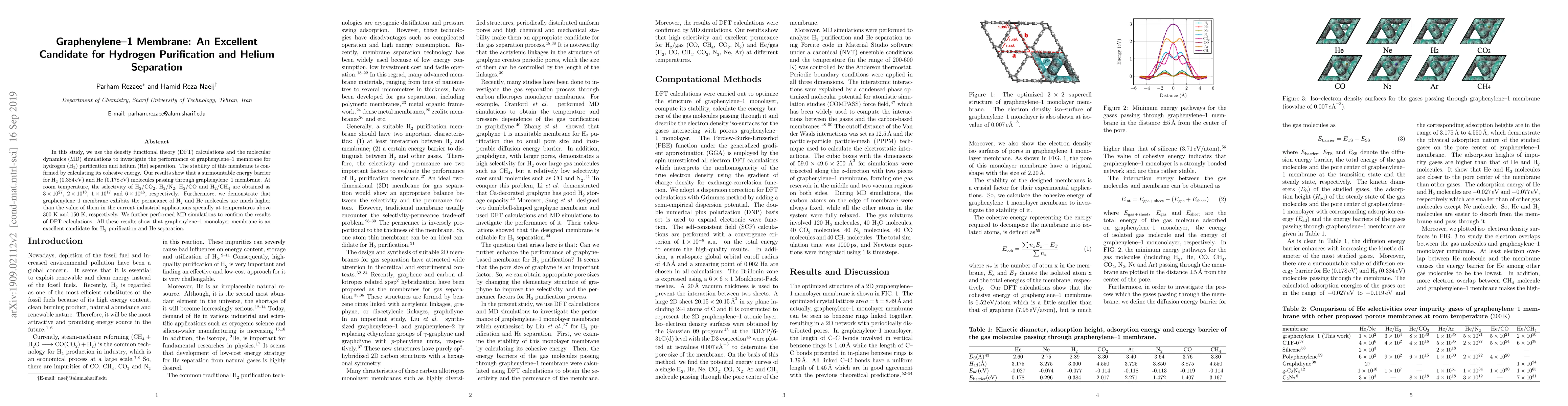 This study uses DFT calculations and MD simulations to demonstrate that graphenylene-1 membrane exhibits high selectivity and permeance for hydrogen purification and helium separation, with significant advantages over current industrial applications, especially at elevated temperatures. The membrane's stability and performance suggest it is a promising candidate for these applications.