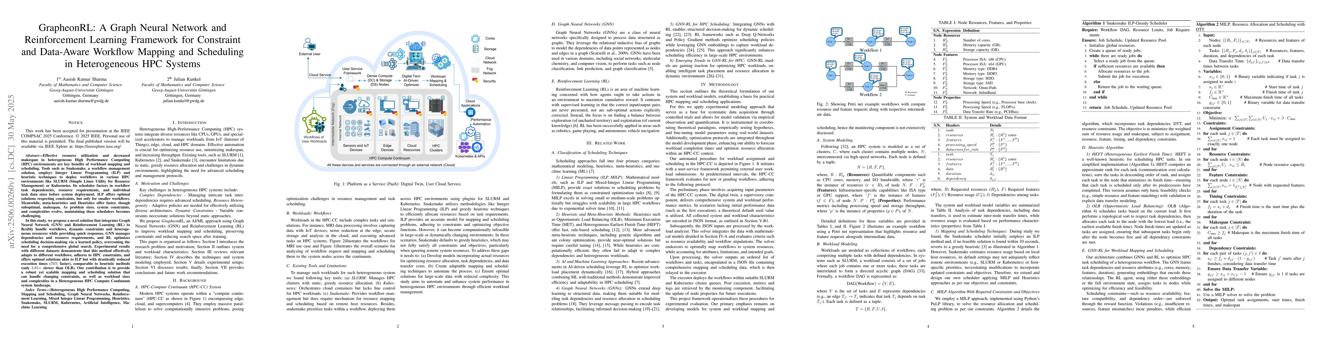 Effective resource utilization and decreased makespan in heterogeneous High Performance Computing (HPC) environments are key benefits of workload mapping and scheduling. Tools such as Snakemake, a workflow management solution, employ Integer Linear Programming (ILP) and heuristic techniques to deploy workflows in various HPC environments like SLURM (Simple Linux Utility for Resource Management) or Kubernetes. Its scheduler factors in workflow task dependencies, resource requirements, and individual task data sizes before system deployment. ILP offers optimal solutions respecting constraints, but only for smaller workflows. Meanwhile, meta-heuristics and heuristics offer faster, though suboptimal, makespan. As problem sizes, system constraints, and complexities evolve, maintaining these schedulers becomes challenging. In this study, we propose a novel solution that integrates Graph Neural Network (GNN) and Reinforcement Learning (RL) to flexibly handle workflows, dynamic constraints, and heterogeneous resources while providing quick responses. GNN manages dependencies and resource requirements, and RL optimizes scheduling decision-making via a learned policy, overcoming the need for a comprehensive global search. Experimental results with different datasets demonstrate that this method effectively adapts to different workflows, adheres to HPC constraints, and offers optimal solutions akin to ILP but with drastically reduced execution times (76 percent faster), comparable to heuristic methods (only 3.85 times slower than OLB). Our contribution is to provide a robust yet scalable mapping and scheduling solution that can handle changing constraints, as well as workload sizes and complexities in a heterogeneous HPC Compute Continuum system landscape.