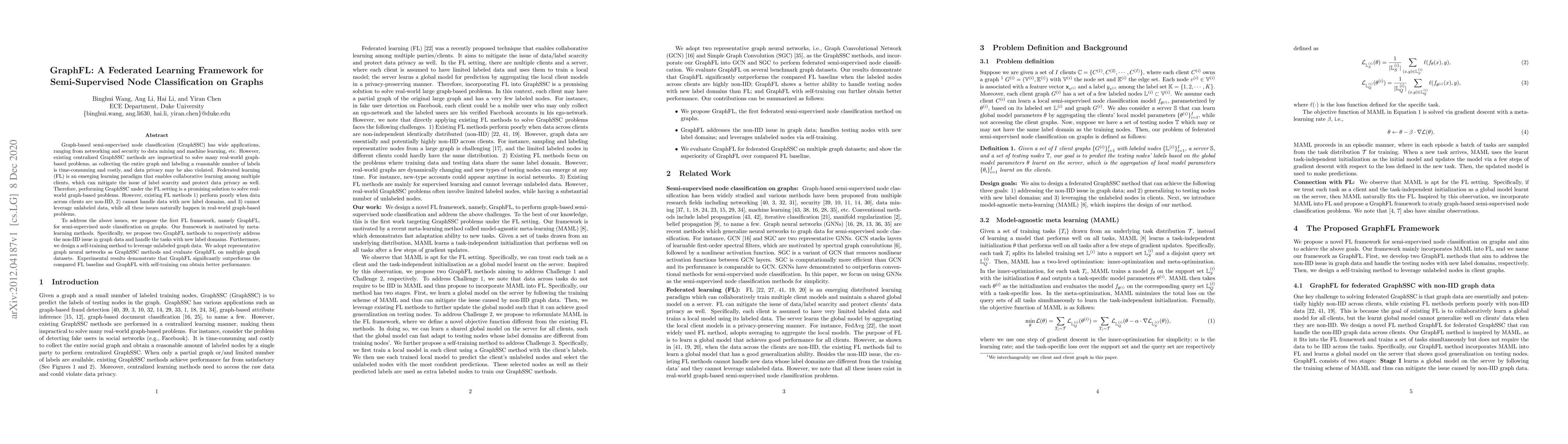 Graph-based semi-supervised node classification (GraphSSC) has wide applications, ranging from networking and security to data mining and machine learning, etc. However, existing centralized GraphSSC methods are impractical to solve many real-world graph-based problems, as collecting the entire graph and labeling a reasonable number of labels is time-consuming and costly, and data privacy may be also violated. Federated learning (FL) is an emerging learning paradigm that enables collaborative learning among multiple clients, which can mitigate the issue of label scarcity and protect data privacy as well. Therefore, performing GraphSSC under the FL setting is a promising solution to solve real-world graph-based problems. However, existing FL methods 1) perform poorly when data across clients are non-IID, 2) cannot handle data with new label domains, and 3) cannot leverage unlabeled data, while all these issues naturally happen in real-world graph-based problems. To address the above issues, we propose the first FL framework, namely GraphFL, for semi-supervised node classification on graphs. Our framework is motivated by meta-learning methods. Specifically, we propose two GraphFL methods to respectively address the non-IID issue in graph data and handle the tasks with new label domains. Furthermore, we design a self-training method to leverage unlabeled graph data. We adopt representative graph neural networks as GraphSSC methods and evaluate GraphFL on multiple graph datasets. Experimental results demonstrate that GraphFL significantly outperforms the compared FL baseline and GraphFL with self-training can obtain better performance.