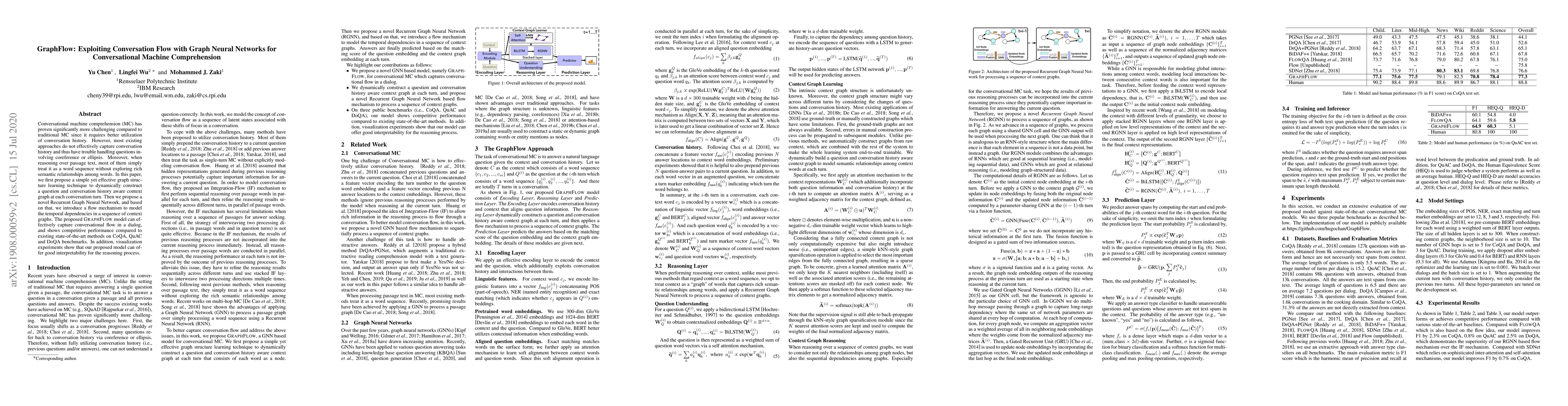 The paper introduces GraphFlow, a model that uses graph neural networks to dynamically construct context graphs for conversational machine comprehension, capturing temporal dependencies and improving performance on benchmarks. Visualization experiments demonstrate the model's interpretability.