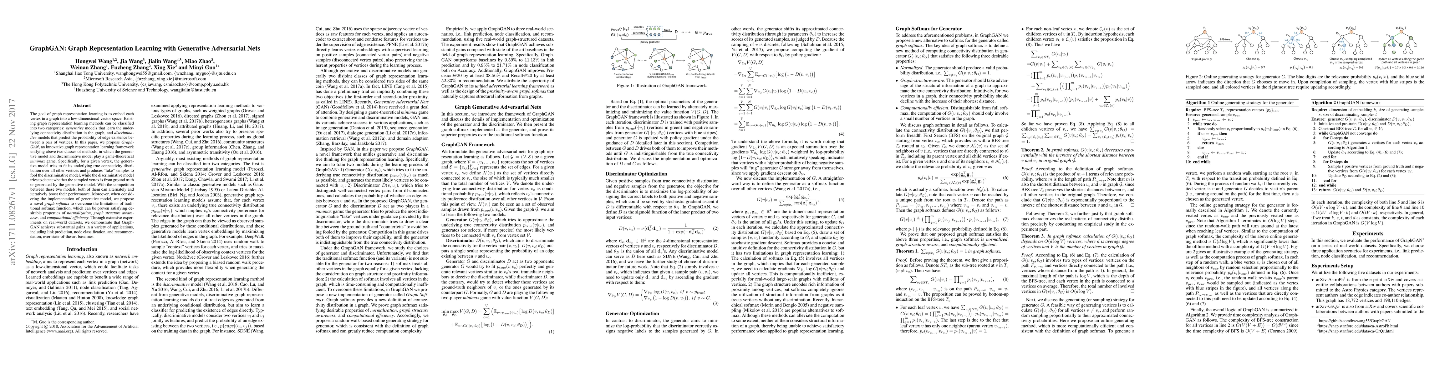 GraphGAN integrates generative and discriminative models for graph representation learning through a minimax game, enhancing both models' performance. It employs a novel graph softmax to improve efficiency and accuracy, achieving superior results in link prediction, node classification, and recommendation.