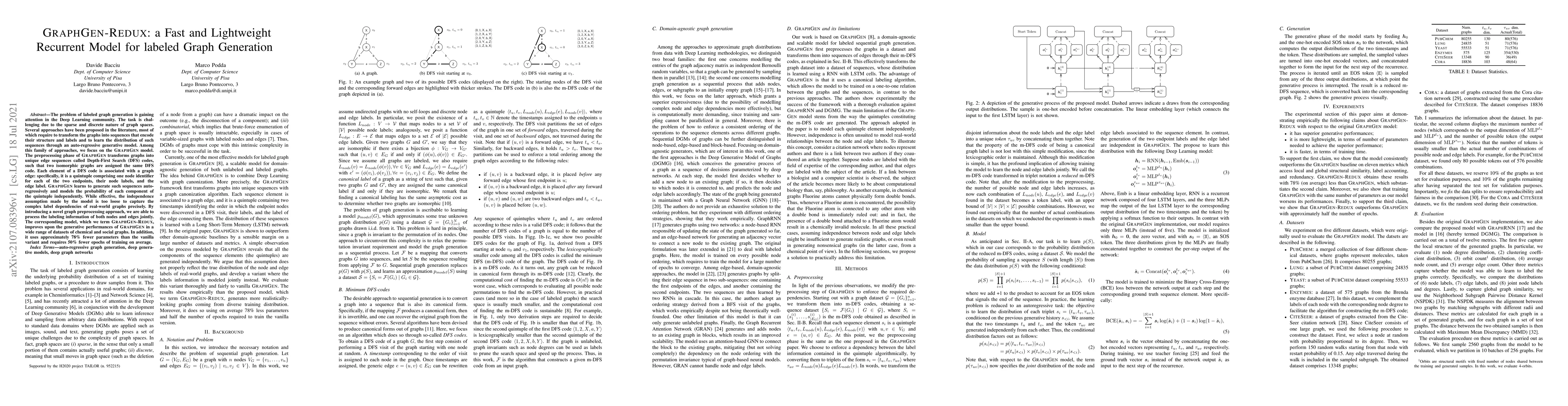 The problem of labeled graph generation is gaining attention in the Deep Learning community. The task is challenging due to the sparse and discrete nature of graph spaces. Several approaches have been proposed in the literature, most of which require to transform the graphs into sequences that encode their structure and labels and to learn the distribution of such sequences through an auto-regressive generative model. Among this family of approaches, we focus on the GraphGen model. The preprocessing phase of GraphGen transforms graphs into unique edge sequences called Depth-First Search (DFS) codes, such that two isomorphic graphs are assigned the same DFS code. Each element of a DFS code is associated with a graph edge: specifically, it is a quintuple comprising one node identifier for each of the two endpoints, their node labels, and the edge label. GraphGen learns to generate such sequences auto-regressively and models the probability of each component of the quintuple independently. While effective, the independence assumption made by the model is too loose to capture the complex label dependencies of real-world graphs precisely. By introducing a novel graph preprocessing approach, we are able to process the labeling information of both nodes and edges jointly. The corresponding model, which we term GraphGen-Redux, improves upon the generative performances of GraphGen in a wide range of datasets of chemical and social graphs. In addition, it uses approximately 78% fewer parameters than the vanilla variant and requires 50% fewer epochs of training on average.