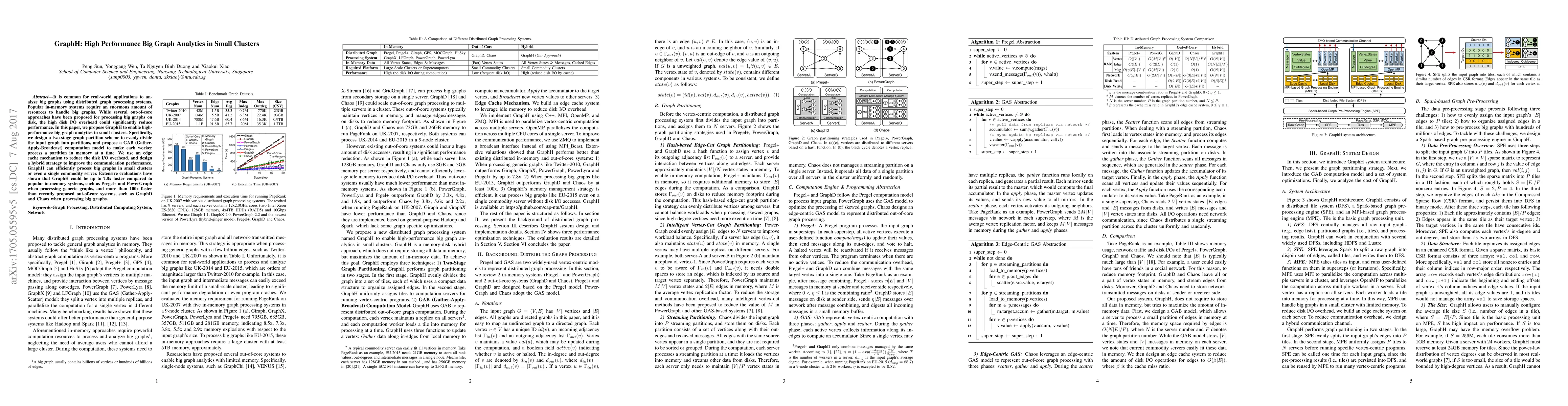 GraphH proposes a two-stage partition scheme and a GAB computation model to enable high-performance big graph analytics in small clusters, using an edge cache and hybrid strategy to reduce disk I/O and improve communication, achieving up to 7.8x faster performance compared to in-memory systems and over 100x faster than out-of-core systems.