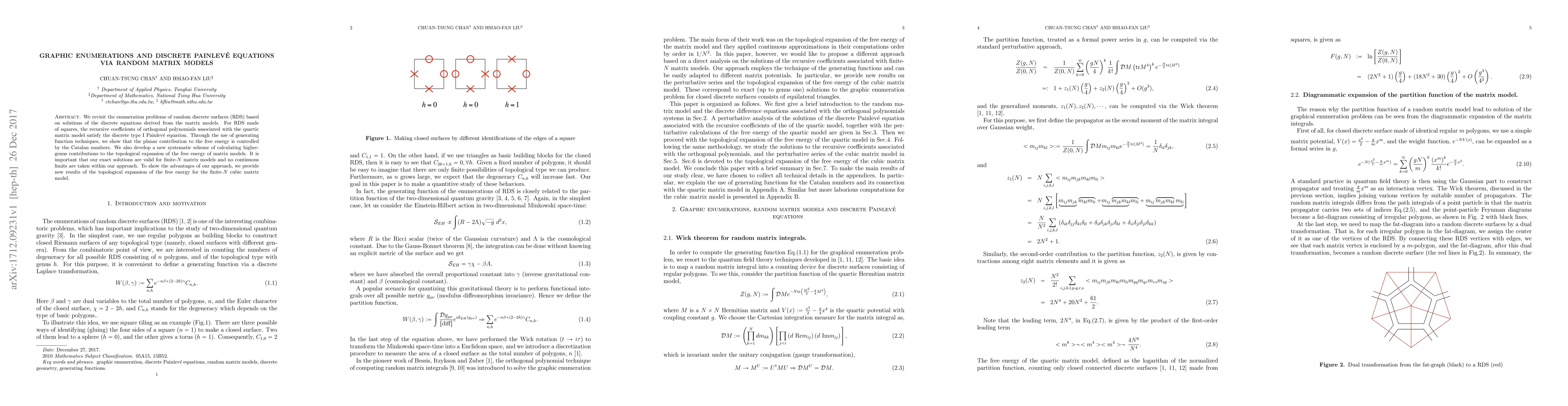 This paper explores enumeration problems of random discrete surfaces using discrete Painlevé equations derived from matrix models. It demonstrates that the planar contribution to the free energy is governed by Catalan numbers and introduces a new method for calculating higher-genus contributions to the topological expansion of matrix model free energies, valid for finite-$N$ models without continuous limits.