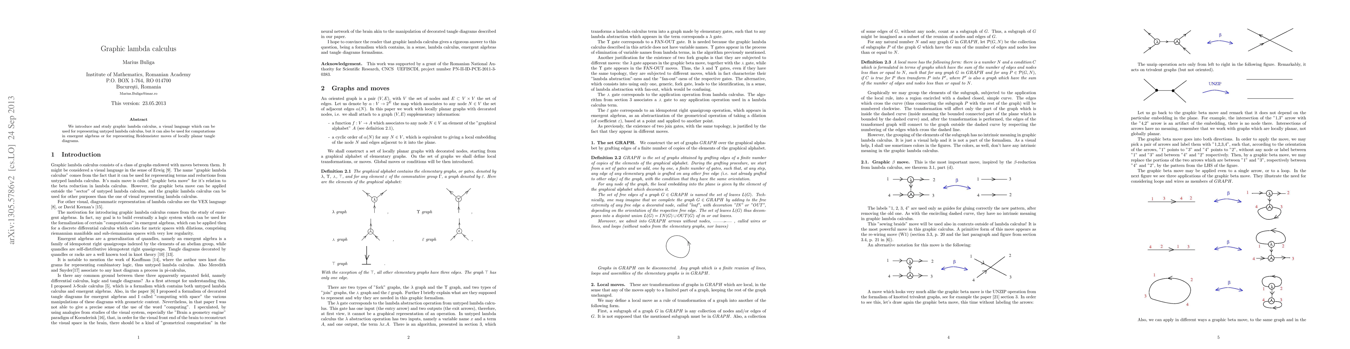 Graphic lambda calculus is a visual language for representing untyped lambda calculus, emergent algebras, and Reidemeister moves in locally planar tangle diagrams. It provides a graphical alternative to traditional lambda calculus notation.