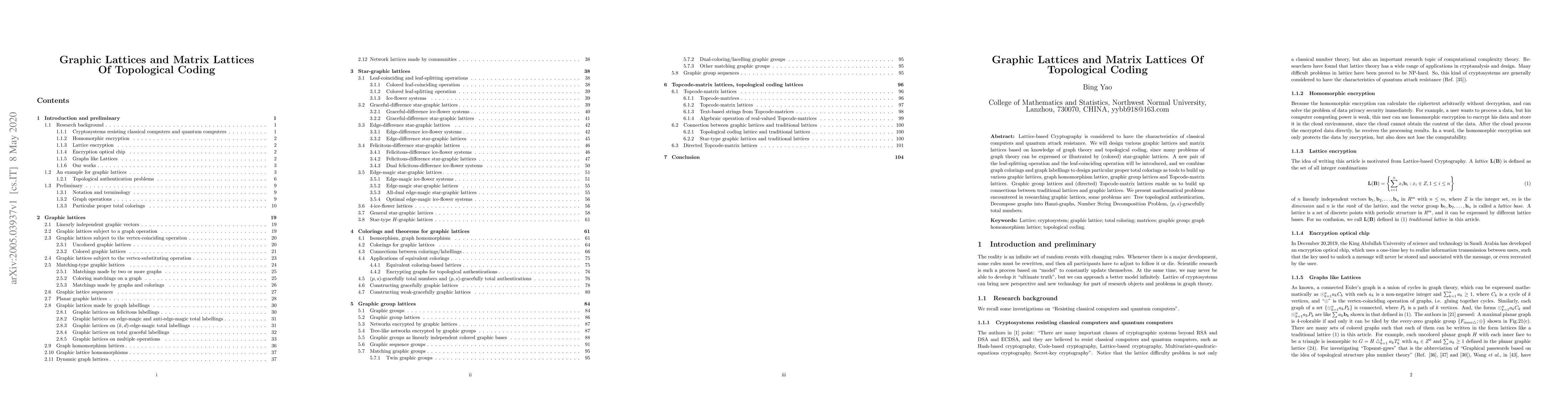 This paper explores lattice-based cryptography through the design of graphic and matrix lattices utilizing graph theory and topological coding. It introduces new leaf-splitting and leaf-coinciding operations and uses graph colorings to construct various lattices, linking traditional and graphic lattices, and discusses mathematical problems like Tree topological authentication and $(p,s)$-gracefully total numbers.