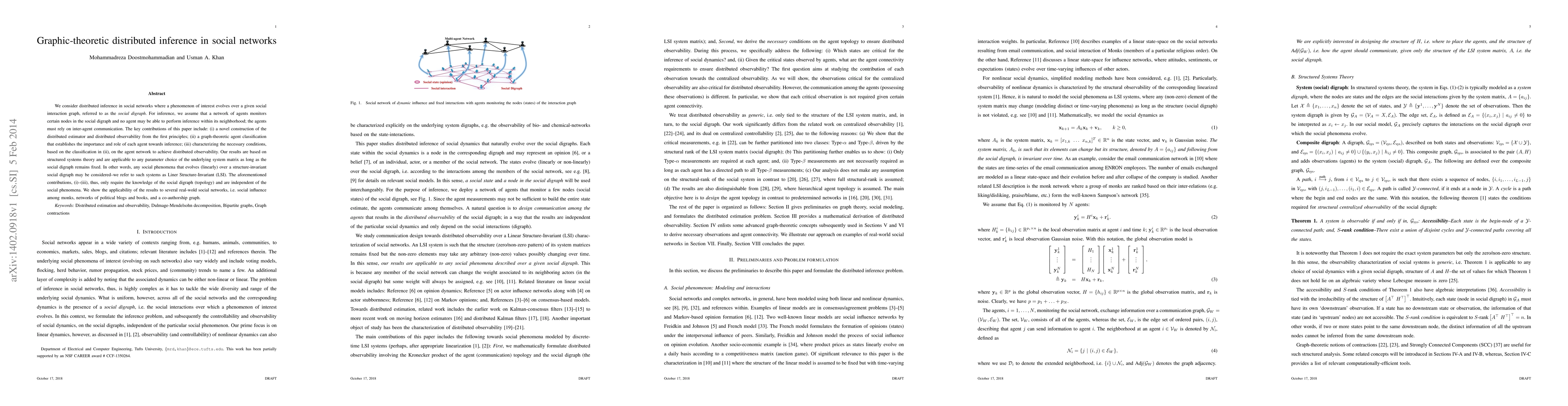 We consider distributed inference in social networks where a phenomenon of interest evolves over a given social interaction graph, referred to as the \emph{social digraph}. For inference, we assume that a network of agents monitors certain nodes in the social digraph and no agent may be able to perform inference within its neighborhood; the agents must rely on inter-agent communication. The key contributions of this paper include: (i) a novel construction of the distributed estimator and distributed observability from the first principles; (ii) a graph-theoretic agent classification that establishes the importance and role of each agent towards inference; (iii) characterizing the necessary conditions, based on the classification in (ii), on the agent network to achieve distributed observability. Our results are based on structured systems theory and are applicable to any parameter choice of the underlying system matrix as long as the social digraph remains fixed. In other words, any social phenomena that evolves (linearly) over a structure-invariant social digraph may be considered--we refer to such systems as Liner Structure-Invariant (LSI). The aforementioned contributions, (i)--(iii), thus, only require the knowledge of the social digraph (topology) and are independent of the social phenomena. We show the applicability of the results to several real-wold social networks, i.e. social influence among monks, networks of political blogs and books, and a co-authorship graph.